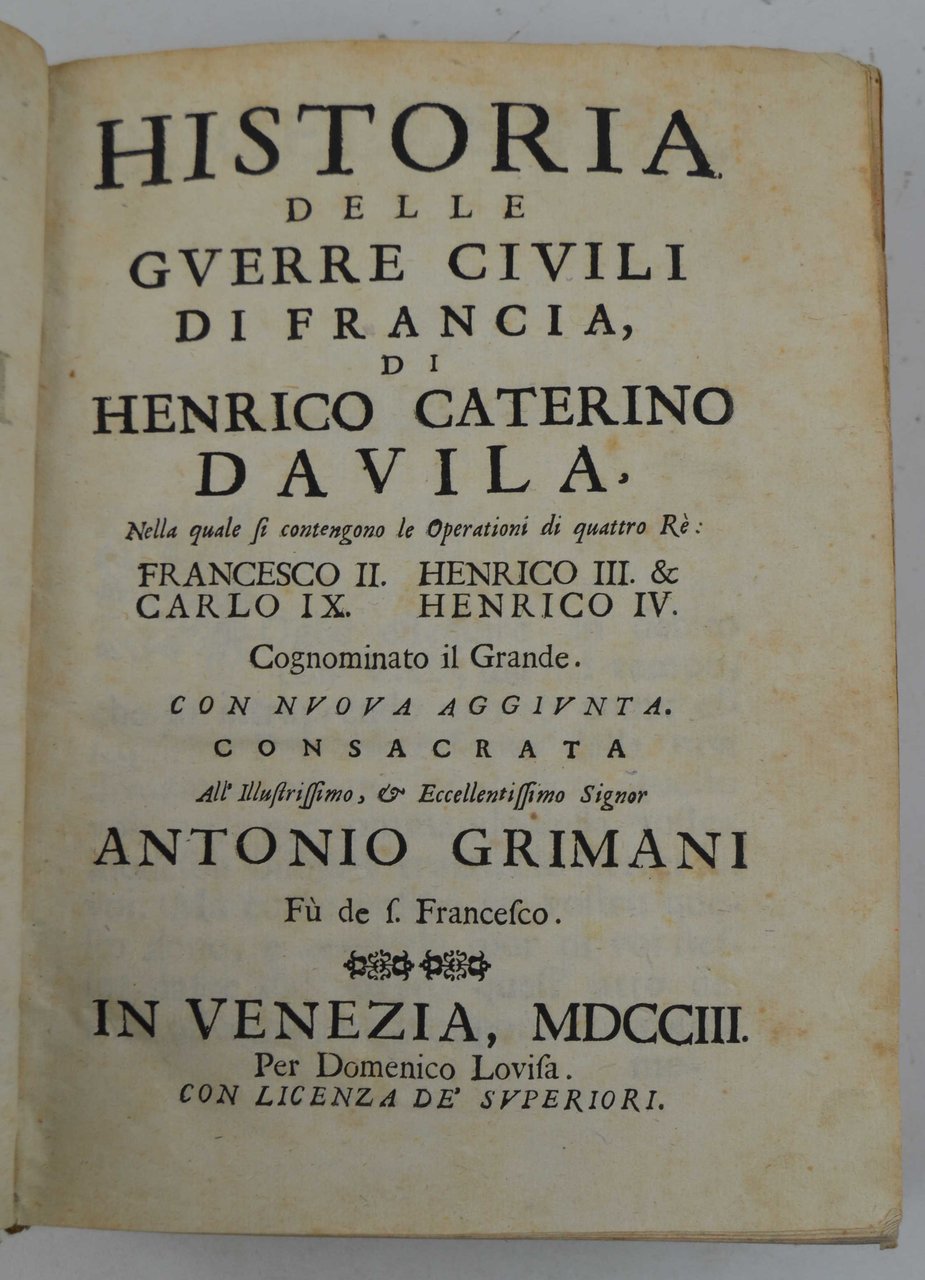 Cm. 22,5, pp. (28) 834 + 32 (2) contenenti la nuova aggiunta. Solida legatura coeva in piena pergamena semirigida, dorso liscio con titoli ben manoscritti. Una mancanza al margine bianco dell'occhietto, peraltro esemplare genuino eben conservato. Buona edizione. Cfr. Piantanida (570): ".opera storica assai importante per lo stile e l'efficacia delle descrizioni".