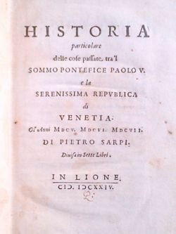Historia particolare delle cose passate tra 'l sommo pontefice Paolo V e la serenissima Repubblica di Venezia. Gl'anni MDCV, MDCVI, MDCVII, di Pietro Sarpi divisa in sette libri.