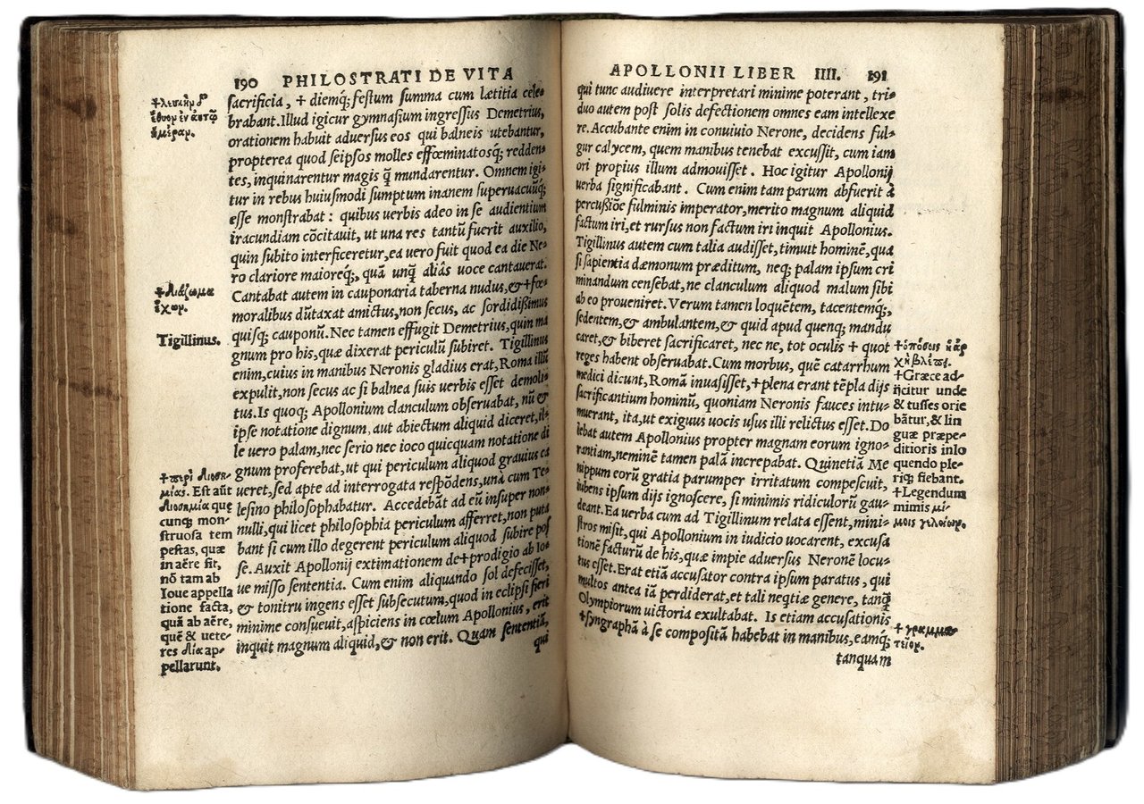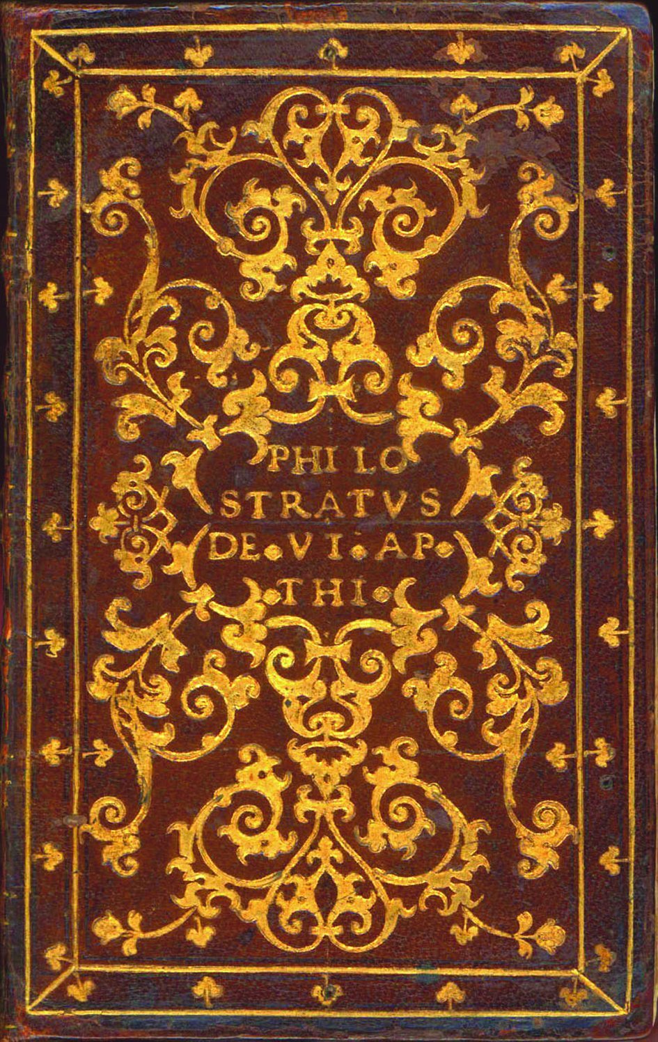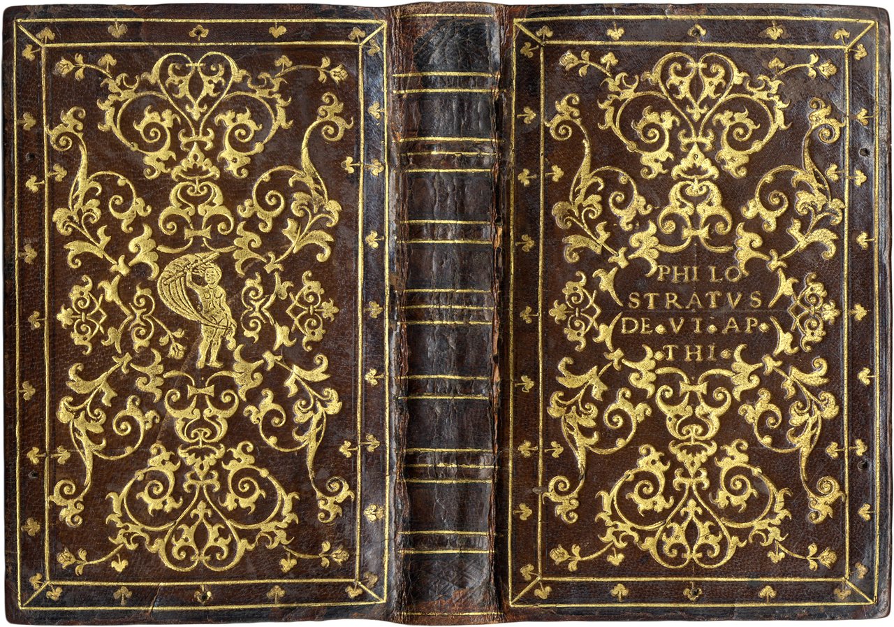 >in-8, (158x100 mm), pp. (16), 460, (4), car. tondo e corsivo, passaggi in greco. Iniziali silografiche istoriate. (Antica scritta di proprietà sul foglio di titolo, lievi ingialliture). Pregiata edizione. Esemplare in preziosa legatura strettamente coeva, piena pelle granata interamente decorata in oro ai piccoli ferri da artista veneziano o bolognese con filetti e finissimi intrecci vegetali, dorso a nervi con filetti oro, tagli dorati e cesellati. Al centro del piatto anteriore è impressa la scritta "Philostratus de Vi. Ap.Thi.". Al centro del secondo piatto figura il simbolo della "Fortuna" (simili legature sono descritte dal De Marinis, La legatura artistica in Italia XV-XVI sec., nei capitoli su Bologna e Venezia). In ottima conservazione (lieve difetto alla cerniera superiore). Splendido volume. BMC 694.
