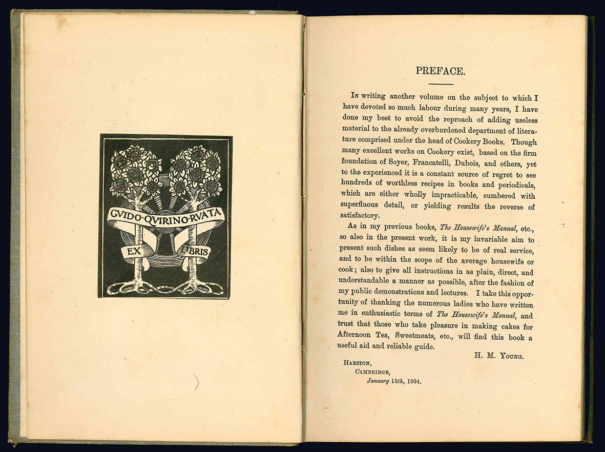 Interessante libro di gastronomia nel quale l'autrice presenta diverse ricette per torte, dolci, puddings, confetture e vini.