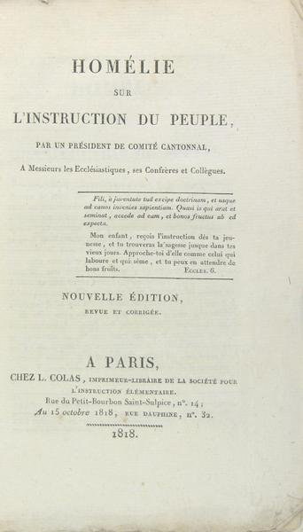 Homélie sur l’instruction du peuple, par un président du Comite Cantonnal, à Messieurs les Ecclésiastiques, ses Confrères et Collègues.