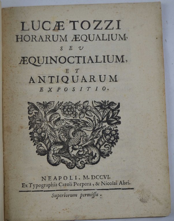 Cm. 21, pp. 18 (2). Bella vignetta xilografica al frontespizio, testatine a copolettera decorati. Leg. recente in carta d'attesa. Esemplare in ottimo stato di conservazione. Opera del medico campano (Aversa 1638 - 1717), il quale ricoprì la cattedra primaria di medicina a Napoli e più tardi gli fu affidata la cattedra di medico presso l'Università della Sapienza. Rara prima edizione. Cfr. Riccardi: "Il Tozzi prende in esame ciò che volle dire Galieno parlando delle ore euinoziali od eguali"; Poggendorf.