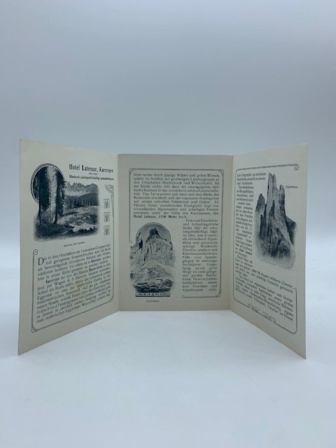 Pieghevole di 6 facciate (ciascuna facciata misura cm 11 x 16) con 5 illustrazioni nel testo in bianco/nero. Pieghevole non datato, ma ascrivibile agli anni Trenta, in lingua tedesca, dell'Hotel Latemar di Karersee con descrizione delle bellezze naturalistiche locali.