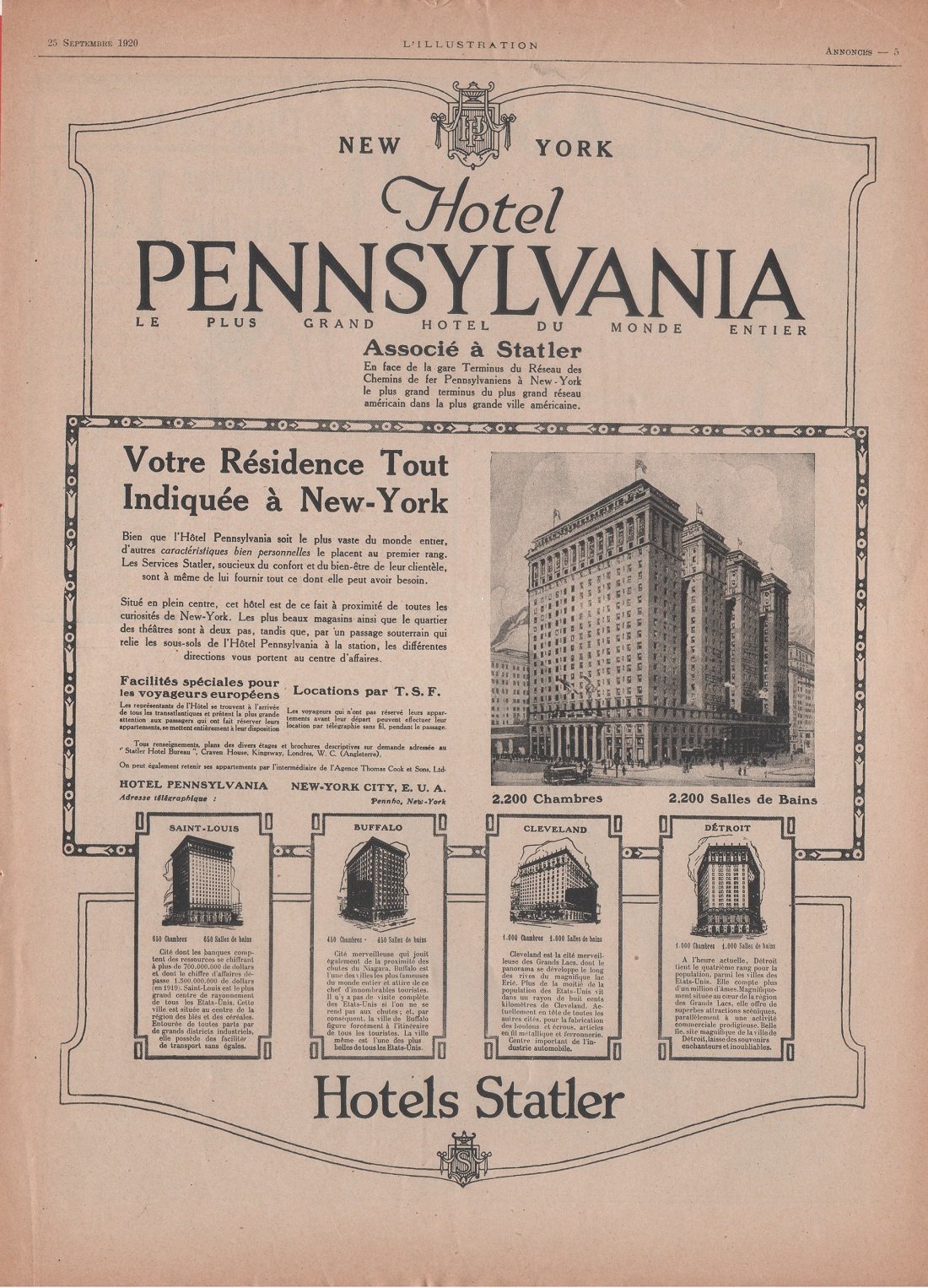 Hotel Pennsylvania New York. Advertising 1920