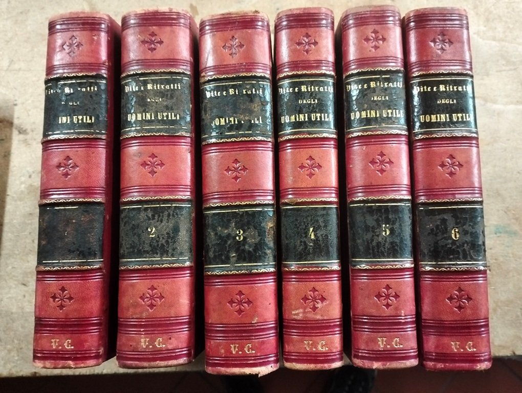 8° bella legat. coeva mezza pelle rossa, tit. oro e nervi ai dorsi, opera completa in 6 volumi, pp. 608; 648; 604; 563; 660; 548. Con 228 ritratti incisi in rame f.t. protetti da velina. Testo inquadrato da filetto, vignette incise, capilettera ornati e fregi xilogr. Tit. al dorso del 1° vol. parz. scolorito, alcune fiorit. sparse ma buon esempl.