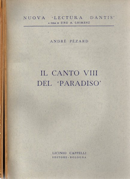 Collana Nuova Lectura Dantis, a cura di Siro A. Chimenez. Opera incompleta composta da 3 fascicoli nello specifico i numeri VIII-XIX-XXIX. Ciascun canto è scritto da autori diversi ed appartiene ad edizioni varie. Fascicoli con copertine in cartoncino che appaiono scolorite e dorate dal tempo in modo non uniforme, in particolare al dorso. Lievi segni d'uso ad angoli e bordi. Interno in buono stato, pagine naturalmente imbrunite. Numero pagine oltre 90. USATO