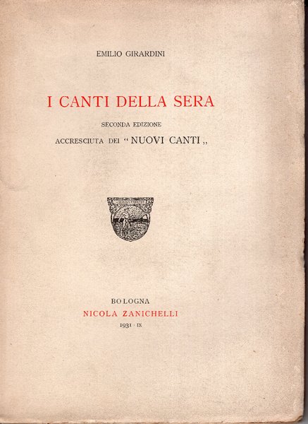 In 8, pp. VIII, 194, [2], brossura. Seconda edizione accresciuta dei Nuovi canti. Raccolta di poesie. Carta scurita altrimenti buono. in ottavo Buono (Good) .