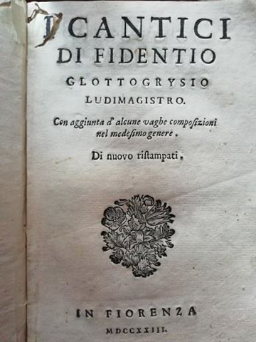 Seconda edizione delle poesie satiriche di Scroffa Camillo. Seguito dai Cantici di versi di Heryllum Argyroglotti. Durante il soggiorno a Padova Scroffa dovette conoscere, direttamente o indirettamente, Pietro Fidenzio Giunteo da Montagnana, il «ludimagistro» satireggiato nei Cantici: «un letterato di vaglia, che datosi per mestiere all’insegnare, aveva in Padova scuola di grammatica, stipendiato dal pubblico consuetamente, e dai discepoli per lezioni fuori del debito suo [.].Da tale predilezione, oltre che dalla mania latineggiante di Giunteo, Scroffa trasse intorno al 1550 il malizioso spunto iniziale dei suoi Cantici di Fidenzio, esile canzoniere formato da una ventina di componimenti, in maggioranza sonetti, ma anche una sestina, due capitoli in terza rima di circa duecento versi ciascuno e il seguente epitaffio: «Glottocrisio Fidentio eruditissimo / ludimagistro è in questo gran sarcophago. / Camillo crudo più d’un antropophago / l’uccise. O caso ai buoni damnosissimo!» Nei Cantici di Fidenzio, come più tardi nel Candelaio (ma nella commedia di Giordano Bruno si accentuò la vis polemica), la satira della pedanteria si unisce a quella del petrarchismo. Fidenzio «geme la sua passione come un messer Francesco Petrarca che sia passato attraverso lo stile del Polifilo» (Croce, 1931, p. 79), rivolgendosi però non a una donna, ma a un suo giovane discepolo; ne risulta un trasgressivo declassamento dell’oggetto letterario, atto di per sé a generare il ridicolo. Lo stesso abnorme latineggiamento che caratterizza il discorso poetico si risolve talora nella degradazione di una realtà figurata e spirituale al mero senso fisico: il verso d’esordio del Canzoniere petrarchesco, Voi ch’ascoltate in rime sparse il suono, diviene per esempio Voi ch’auribus arrectis auscultate, cioè ‘ascoltate con le orecchie tese. Legatura in carta originale, un frontalino. Pp. 67 Buone condizioni generali.