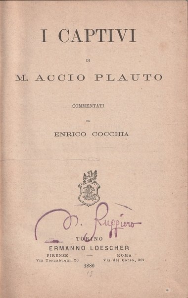 M. Accio Plauto I Captivi. Torino, Loescher 1886 latin, 118 CR.48Copertina rigida,in lingua latina, commentati da Enrico Cocchia, volume in discrete condizioni, segni da scaffalatura agli angoli della copertina, lievi fioriture all'interno, timbro sulla prima pagina118 pagine circacopertina come da foto