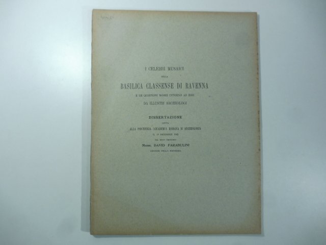 In 4, cm 22,5 x 30, pp.82 con 1 tavola a colori fuori testo. Taglietto al marg. est. delle ccc. Brossura editoriale. Estratto dai Rendiconti della Pontificia Accademia Romana di Archeologia. Argomenti: Basiliche insigni di Ravenna; L'arte orientale; Scrittori che illustrarono la Basilica di Classe e i suoi musaici; Singolare orginalita' di questi; La tribuna; Concetto della composizione dell'abside; Scena della trasfigurazione simbolica; Busto del Salvatore; Croce circondata da una sfera; Apoteosi di S. Apollinare; Sua imagine contemplata da dodici agnelli in un giardino celeste; I tre sacrifizi; La storia di Reparato; L'arco trionfale della tribuna descritto; Due Archangeli e il trisagio; Il sudario; Cinque lettere greche, etc.