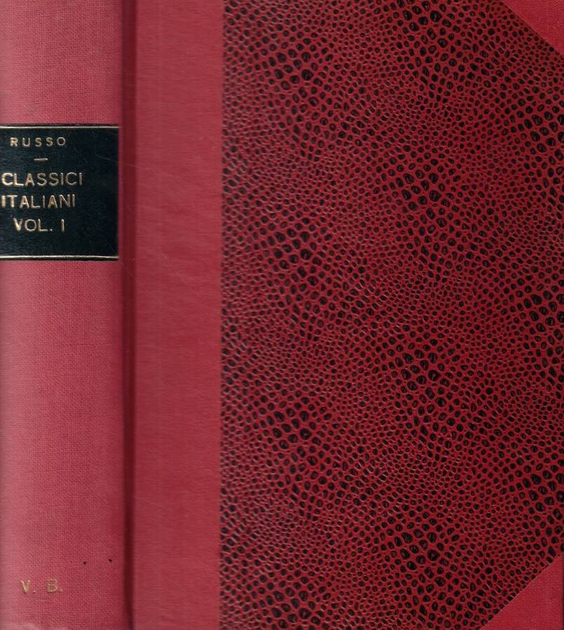 Opera incompleta, vol. 1. A cura di F. Figurelli, R. Ramat, E. Bonara, L. Russo e C. Muscetta. Mezza legatura con angoli in tela rossa e piatti cartonati, non coeva, con titoli in oro solo al dorso all'interno di tassello nero e ben conservata. Pagine molto ingiallite, come pure i tagli, salde e con ampio margine. Piccoli strappetti al frontespizio. Numero pagine 1111.