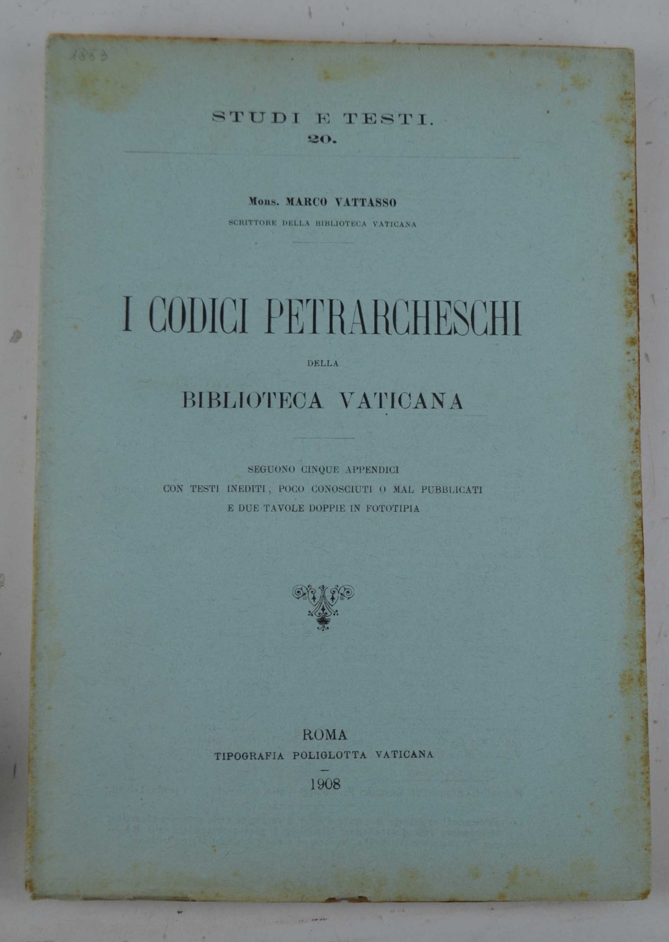 I codici Petrarcheschi della Biblioteca Vaticana. Seguono cinque appendici con testi inediti, poco conosciuti o mal pubblicati e due tavole doppie in fototipia.