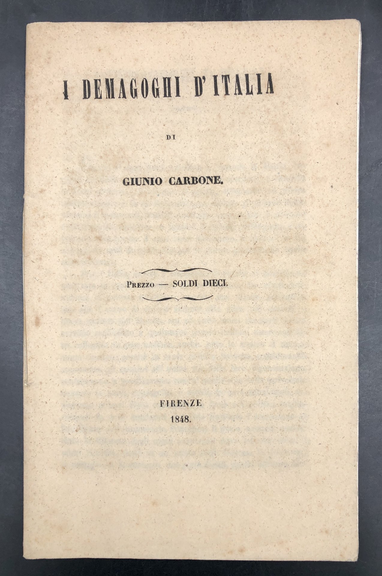 In-8°, pp. 24, sobria brossurina editoriale. Loda le iniziali riforme di Pio IX, incolpa la "setta Austrogesuitica" del voltafaccia del papa. Avverso anche alla "Setta Repubblicana", demagoghi che vorrebbero dividere "l'Italia in tante Repubblichette". Loda Carlo Alberto "che potè subito "saltare in Lombardia con potentissimo esercito". Curioso e feroce attacco a poteri laici e i Gesuiti "e la loro setta), palesi e occulti, a destra e a sinistra, nel cuore del '48. "Il popolo non perituro conosce il so diititto e lo vuole dai governanti riconosciuto. ". CARBONE, divulgatore di storia, poligrafo, bibliotecario alla Magliabechiana. Eccellente esemploare.