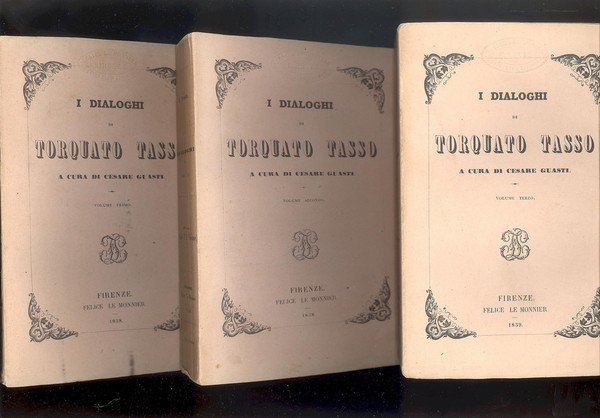 TRE VOLUMI IN 16° ( cm.18,5 X 12 ). VOL.I, pp.XII, 398. VOL.II, pp.VI, 362. VOL.III, pp.XI, 573.<BR>COPERTINE EDITORIALI CON FREGI E TITOLO. L'OPERA, FA SEGUITO ALLE LETTERE DI TORQUATO TASSO, PERCHE' I LETTORI POTESSERO NON SOLO FORMARSI UN INTIERO CONCETTO DELLA DOTTRINA E DELL'ELOQUENZA DELLO SCRITTORE, MA TUTTO COMPRENDERE L'ANIMO E L'INGEGNO DELL'UOMO. CESARE GUASTI ( PO.1822 - FI.1889 ), <BR>SCRITTORE E FILOLOGO ITALIANO. DAL 1853, ACCADEMICO DELLA CRUSCA. DOPO LA MORTE DEL BONAINI ( 1874 ), FU CHIAMATO A SUCCEDERGLI ALLA GUIDA DELL'ARCHIVIO CENTRALE DI STATO. LE SUE CARTE SI CONSERVANO ALLA BIBLIOTECA RONCIONIANA DI PRATO.<BR> ALCUNE FIORITURE SPARSE DOVUTE AL TIPO DI CARTA, ALTRIMENTI OTTIMA CONSERVAZIONE. INTONSO. ID3443