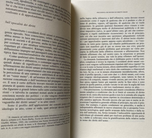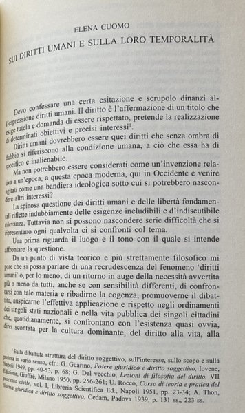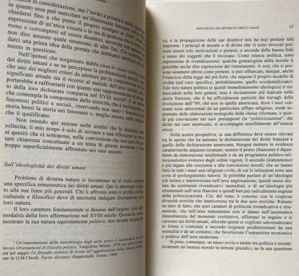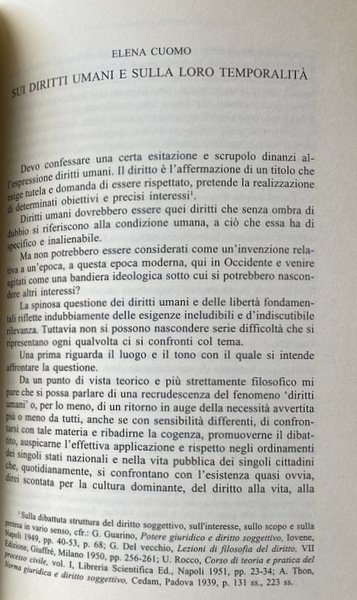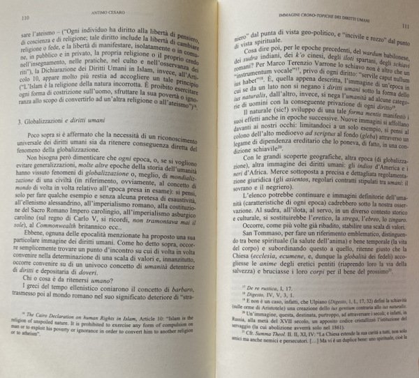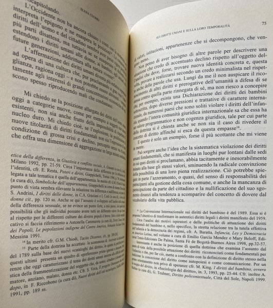 Soggetti: Diritto, Scienze giuridiche, Filosofia, Politica, Diritti umani, Doveri, Tutela, Universalismo, Ideologie politiche, Stato, Universalità, Globalizzazione, Multiculturalismo, Biotecnologie, Vita, Parità di genere, Donne, Religione, Fede, Tradizioni culturali, Mutamenti sociali, Società, Libertà, Temporalità, Costituzione, Principi fondamentali, Uguaglianza, Rispetto, Diversità, Personalità, Collettività, Cittadinanza, Persona umana, Inalienabili, Limiti, Garanzie, Ostacoli, Pensiero, Coscienza, Stampa, Ordinamento giuridico, Liberalismo, Clausola, Inviolabilità, Comunicazione, Governo, Controllo politico, Salute, Morte, Malattia, Povertà, Sussistenza, Limitazioni, Eccezioni, Emergenza, Guerre, Libri universitari, Scienze sociali, Precedenza, Epocalità, Eticità, Razionalismo occidentale, Regole, Consuetudini, Relazioni, Massa, Mondializzazione, Egemonia culturale, Potere, Schiavitù, Resistenza, Autodeterminazione, Popoli, Natura, Dignità, Uomo, Rivoluzione francese, Indipendenza, Ambiente, Animali, Esseri viventi, Sanzioni, Tribunale, Perry, Denninger, Jacques Maritain, Thomas Wilson, Vilfredo Pareto, Nazioni Unite, Difesa, Diritti economici, Civili, Sessualità, Identità sessuale, Bambini, Lavoro, Definizione, Dichiarazione Universale, Saggistica, Libri Fuori catalogo, Democrazia, Critica, Esportazione, Guillaume Faye, Guarino, Domenico Losurdo, Politicizzazione, Storicità, Fascismo, Nazismo, Shoah, Persecuzioni, Etnocidio, Carta, America, Norimberga, Clinica, Terapeutica, Manipolazioni genetiche, Medicina, Biologia, Cure, Convenzioni, Leggi, Sentenze, Giudizio, Corte Internazionale, Industria, Multinazionali, Sfruttamento, Necessità, Aborto, Nascita, Trapianti, Protezione, Eutanasia, Eugenetica, Villaggio Globale, Individuo, Riccobono, Veca, Baratta, Capozzi, Rodotà, Kant, Regimi, Dittatura, Valori, Riconoscimento, Riferimento, Bibliografia, Consultazione, Islam, Fondamentalismo, Teocrazie, Shari'a, Ebrei, Genocidio, Legal sciences, Philosophy, Politics, Human rights, Duties, Protection, Universalism, Political ideologies, State, Universality, Globalization, Multiculturalism, Biotechnology, Life, Gender equality, Women, Religion, Faith, Cultural traditions, Social changes, Society, Freedom, Temporality, Constitution, Fundamental principles, Equality, Respect, Diversity, Personality, Collectivity, Citizenship, Human person, Inalienable, Limits, Guarantees, Obstacles, Thought, Consciousness, Press, Legal order, Liberalism, Clause, Inviolability, Communication, Government, Political control, Health, Death, Illness, Poverty, Subsistence, Limitations, Exceptions, Emergency, Wars, University books, Social sciences, Precedence, Epocality, Ethics, Western rationalism, Rules, Customs, Relations, Globalization, Cultural hegemony, Power, Slavery, Resistance, Self-determination, Peoples, Nature, Dignity, Man, French revolution, Independence, Animals, Living beings, Sanctions, Court, United Nations, Defense, Economic rights, Sexuality, Sexual identity, Children, Work, Definition, Universal Declaration, Non-fiction, Out of print books, Democracy, Criticism, Export, Politicization, Historicity, Persecutions, Ethnocide, Paper, Nuremberg, Therapeutic, Genetic manipulations, Medicine, Biology, Conventions, Laws, Judgments, Judgment, International Court, Industry, Multinationals, Exploitation, Necessity, Abortion, Birth, Transplants, Protection, Euthanasia, Eugenics, Global Village, Individual, Regimes, Dictatorship, Values, Recognition, Reference, Bibliography, Consultation, Fundamentalism, Theocracies, Jews, Genocide