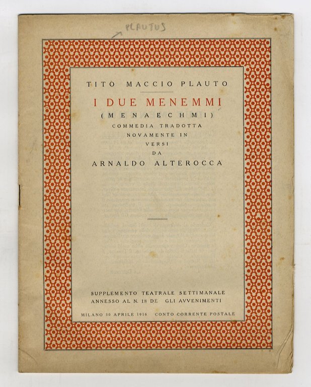 I due Menemmi (Menaechmi). Commedia tradotta novamente in versi da Arnaldo Alterocca.