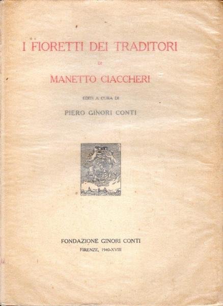 I fioretti dei traditori di Manetto Ciaccheri, prima edizione marzo 1940, pp. 62, formato 16,5 x 22,5.<BR>Copertina morbida di colore beige con titoli in nero e rosso al piatto anteriore e in nero sul dorso. Presente sovraccoperta protettiva trasparente.<BR>Leggera brunitura delle pagine. Nel complesso condizioni molto buone.<BR><BR>