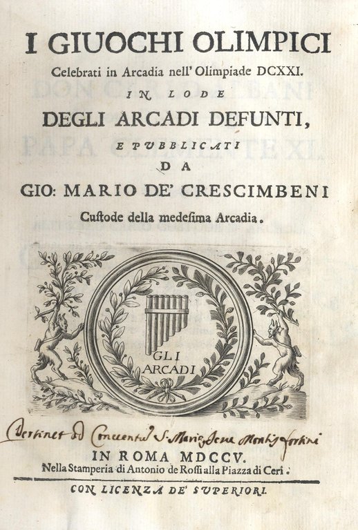 I Giuochi Olimpici celebrati in Arcadia nell'Olimpiade DCXXI. In lode degli Arcadi defunti, e pubblicati da Gio. Maria De' Crescimbeni custode della medesima Arcadia.
