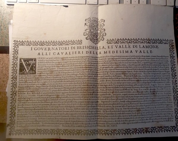 un foglio volante 30x38 cm, in cornice tipografica con capolettera inciso e stemma.