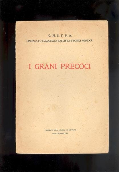 IN 8°, pp.14, COPERTINA EDITORIALE CON TITOLO IN ROSSO. PLACCHETTA A CURA DEL<BR>SINDACATO NAZIONALE FASCISTA TECNICI AGRICOLI SUI GRANI PRECOCI NAZIONALI E LA BATTAGLIA DEL GRANO.RIPORTATI IN APPENDICE, I DATI DI ALCUNE PRODUZIONI MASSIME AD ETTARO, RAGGIUNTE, NEL 1929, CON TALI GRANI PRECOCI IN ALCUNE PROVINCIE ITALIANE. OTTIMA CONSERVAZIONE, SALVO SEGNI D'USO.