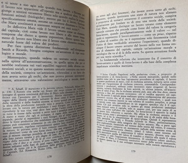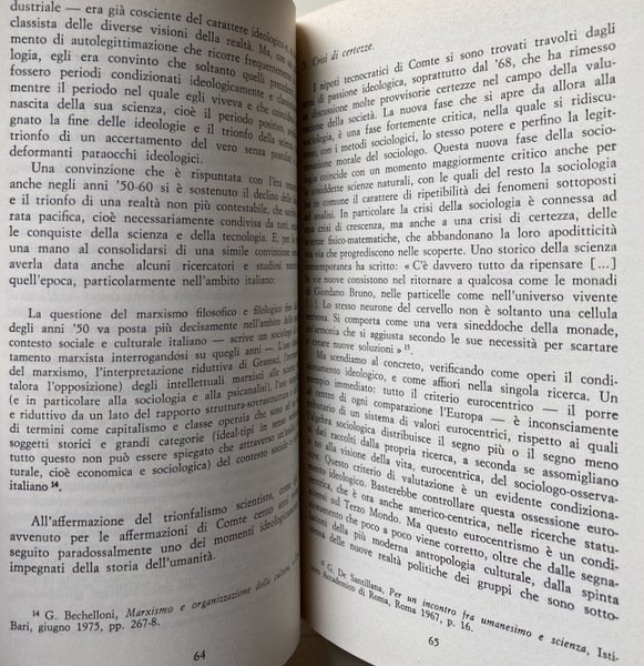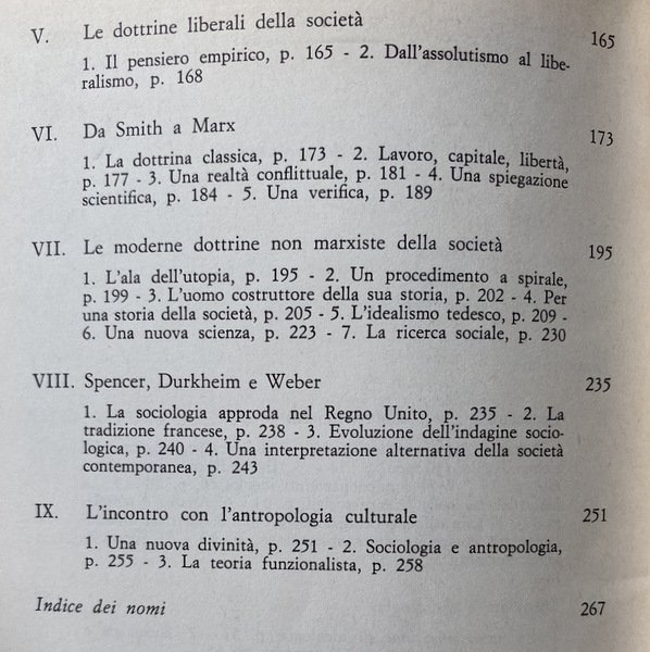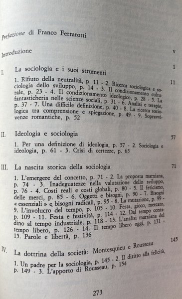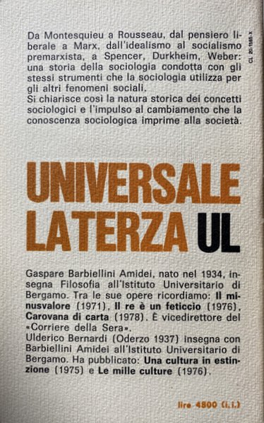 Soggetti: Sociologia, Scienze sociali, Politica, Storia, Teorie sociologiche, Scienza politica, Storicismo, Anni Settanta, Polemiche, Marxismo, Critica, Interpretazione, Socialismo, Liberalismo, Dinamiche sociali, Élite, Classi sociali, Potere, Stato, Democrazia, Società, Istituzioni, Istruzione, Psicologia sociale, Trasformazioni, Ideologie politiche, Correnti, Pensiero sociologico, Max Weber, Gaetano Mosca, Metodo, Analisi, Neutralità, Ricerca, Strumenti, Indagini, Bisogni, Oggetti, Feticismo delle merci, Tempo libero, Feste, Festività, Industria culturale, Libertà, Famiglia, Gioco, Mercato, Montesquieu, Rousseau, Pedagogia, Educazione, Felicità, Diritto, Diritti economici, Empirismo, Assolutismo, Dottrina classica, Smith, Proletariato, Lotta di classe, Lavoro, Capitale, Capitalismo, Protestantesimo, Idealismo tedesco, Utopia, Spencer, Durkheim, Germania, Francia, Regno Unito, Inghilterra, Evoluzione, Antropologia culturale, Funzionalismo, Riferimento, Bibliografia, Studi culturali, Libri Vintage Fuori catalogo, Adorno, Berger, Comte, Gurvitch, Pollock, Horkheimer, Weil, Burke, Del Noce, Fourier, Godelier, Lenin, Keynes, Kant, Hegel, Jonas, Le Play, Lévy-Strauss, Lukacs, Marcuse, Karl Marx, Mills, Mauss, Parsons, Pareto, Popper, Ricardo, Sweezy, Saint-Simon, Sociology, Social sciences, Politics, History, Sociological theories, Political science, Historicism, Seventies, Controversies, Marxism, Criticism, Interpretation, Socialism, Liberalism, Social dynamics, Social classes, Power, State, Democracy, Society, Institutions, Education, Social psychology, Transformations, Political ideologies, Currents, Sociological thinking, Method, Analysis, Neutrality, Research, Tools, Investigations, Needs, Objects, Commodity fetishism, Leisure, Parties, Festivities, Cultural industry, Freedom, Family, Game, Market, Pedagogy, Education, Happiness, Law, Economic rights, Empiricism, Absolutism, Classical doctrine, Proletariat, Class struggle, Work, Capital, Capitalism, Protestantism, German idealism, Germany, France, United Kingdom, England, Evolution, Cultural anthropology, Functionalism, Reference, Bibliography, Cultural Studies, Out of Print Books