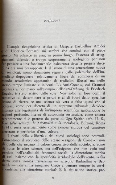 L'ampia ricognizione critica di Gaspare Barbiellini Amidei e di Ulderico Bernardi mi sembra che cominci con il piede giusto. Mi colpisce in essa, in primo luogo, l'assenza di atteggiamenti difensivi o troppo scopertamente apologetici per non far pensare a una fondamentale insicurezza circa la propria disciplina e i suoi presupposti. È il lavoro di una generazione nuova di sociologi, meno duramente segnata dalle polemiche dell'immediato dopoguerra, relativamente libera dai complessi di un mondo accademico appesantito da tradizioni illustri ma nello stesso tempo limitate e inibenti. L'«Anti-Croce», cui Gramsci esortava a por mano sull'esempio dell'Anti-Dühring di Friedrich Engels, è stato scritto dalle cose. Non solo: ai loro occhi il tentativo di determinare a priori e al di fuori dello specifico lavoro di ricerca se una scienza sia vera o falsa quasi che si potesse, come per decreto di un supremo tribunale, decidere intorno alla legittimità di un'impresa scientifica ignorandone le ragioni profonde, interne di autonomia sostanziale, come ancora recentemente si è preteso da parte di Ugo Spirito (cfr. U. S., Due false scienze: la psicanalisi e la sociologia, Bulzoni, Roma 1974), resta essenzialmente come penosa riprova del carattere arretrato e periferico d'una cultura. I frutti della «libertà» dei nuovi sociologi sono notevoli. Consentono il recupero delle stesse «ragioni di Croce»: non di quelle che negano il valore conoscitivo della sociologia, come di tutte le altre scienze, ma dell'esigenza che non vada mai perduta, nell'analisi dei fenomeni sociali, la dimensione storica di essi insieme con la specificità irriducibile dell'evento. Sia detto senza ironica irriverenza scrivono Barbiellini e Bernardi non ci ha insegnato Benedetto Croce a pensare sempre in corrispondenza alla situazione storica? .