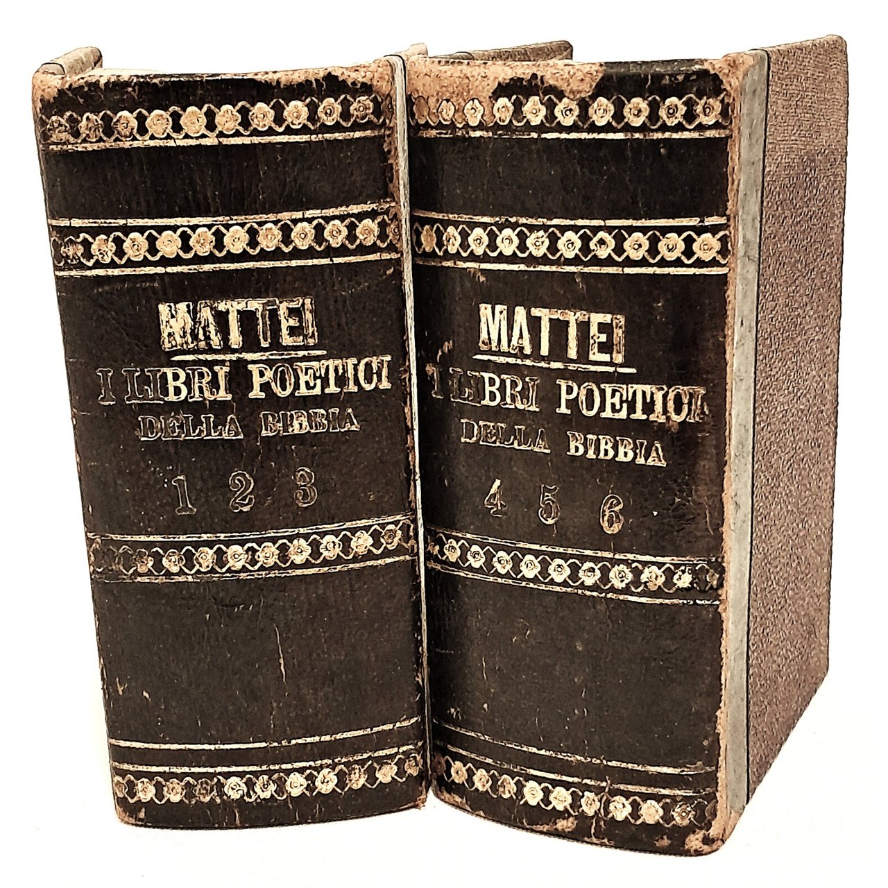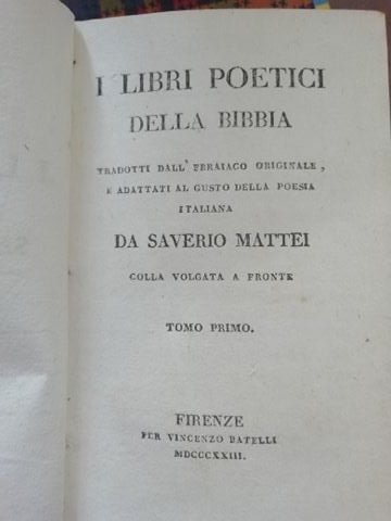 Libri poetici della Bibbia tradotti dall'ebraico originale e adattati in poesia con il latino a fronte. Mattei Saverio (Montepaone, Catanzaro, 1742 - Napoli 1795) letterato italiano. Ingegno versatile, fu poeta, musicologo, filologo, orientalista e giurista. La sua opera più famosa sono i Libri poetici della Bibbia tradotti dall’ebraico e adattati al gusto della poesia italiana (1766-74), libere trasposizioni di temi biblici in forme metriche care all’Arcadia. Per le sue manie grecizzanti venne preso di mira da F. Galiani e G.B. Lorenzi nell’opera buffa Il Socrate immaginario. Cartonato. Pp. 222+242. Ottime condizioni.