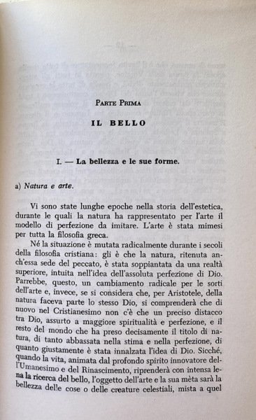 Soggetti: Filosofia, Indagine critica dell'uomo, Aspetti filosofici, Estetica, Natura, Arte, Bellezza, Filosofia greca, Aristotele, Cristianesimo, Umanesimo, Rinascimento, Oggetto, Bello, Arti, Sentimenti, Volontà, Opere, Dio, Pensiero filosofico, Dialettica, Fantasia, Creatività, Creazione, Stili, Artisti, Strumenti, Genialità, Esperienza, Materialità, Storia, Storicità, Evoluzione, Critica d'arte, Psicologia, Canova, Meditazioni, Valori morali, Tetralogia filosofica, Libri Vintage Fuori catalogo, Libri rari, Il conoscere, Conoscenza, Spiritualità, Iconografia, Immagini, Trasmissione, Fruibilità, Fruizione, Mentalità, Rappresentazione, Letteratura, Scultura, Pittura, Musica, Etica, Morale, Essere, Esistenza, Anni Quaranta, Principio di individuazione, Scritti filosofici, Saggi, Sociologia, Scienze umane, Armonia, Canoni, Cultura classica, Philosophy, Critical investigation of man, Philosophical aspects, Aesthetics, Nature, Art, Beauty, Greek philosophy, Aristotle, Christianity, Humanism, Renaissance, Object, Beautiful, Arts, Feelings, Will, Works, God, Philosophical thought, Dialectics, Fantasy, Creativity, Creation, Styles, Artists, Tools, Genius, Experience, Materiality, History, Historicity, Evolution, Art criticism, Psychology, Canova, Meditations, Moral values, Philosophical tetralogy, Out of print books, Rare books, The Knowledge, Spirituality, Iconography, Images, Transmission, Usability, Fruition, Mindset, Representation, Literature, Sculpture, Painting, Music, Ethics, Being, Existence, Forties, Principle of individuation, Philosophical writings, Essays, Sociology, Human sciences, Harmony, Canons, Classical culture