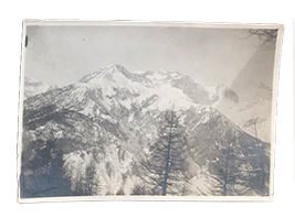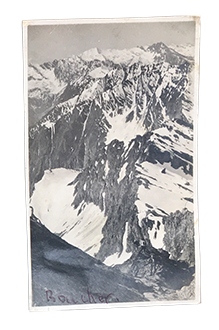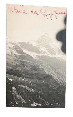 ALBUM oblungo di cm. 24x18, elegabti piatti in cartoncino floscio a righe nere su fondo violetto pallido. FOTO lucide in bianco e nero incollate con cura su 32 facciate di supporti in spesso cartoncino color ghisa legati da cordoncini passanti ai bordi interni e fuori del dorso. Tra cui 5 grandi (cm. 17x12,4), ma perlopiù di cm. 10,5x8,2, le altre di cm. 10,5x5,7 o 8,5x6, poche più piccole. Alcune specificano le località con scritte a penna sui supporti, ma molte con scritte aggiunte recentemente a biro direttamente sulla foto. Ecco i luoghi specificati: Ghiacciaio SEA, Rocca BERNAUDA, ROSA dei BANCHI, Monte TABOR; Valle Stretta; Ghiacciaio GALAMBRA (3 foto); Ghiacciaio di BARD del monte Ciusalet (ora entrambi quasi spariti), DENTI di CUMIANA, LUNELLE di LANZO, Ghiacciaio del Rosa - Zermatt, CROCE ROSSA, Punte Maquignaz & Carrel, i Jumeaux, il Breithorn dallo Zermatt, CERVINO. e MONVISO: il Rifugio Sella era ancora come nel 1905, senza l'ala Sud del 1927, ciò che ci permette di dire che molte foto sono antecedenti al 1927, magari le altre di anni di poco seguenti, come conferma l'abbigliamento casalingo dei gruppi di alpinisti o escursionisti in giacca e camicia, basco o cappello come si usava prima dell'ultima guerra mondiale; ma perlopiù nelle foto dominano le CIME e i GHIACCIAI.