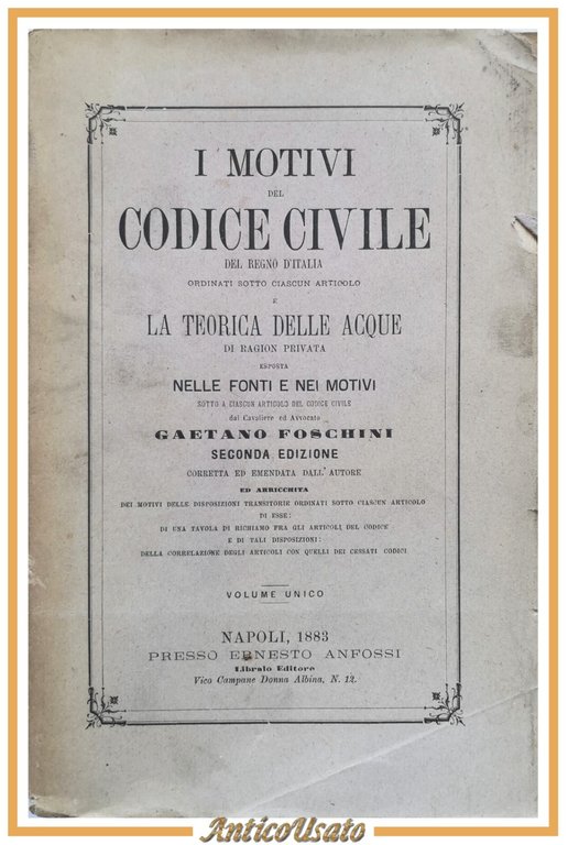 I MOTIVI DEL CODICE CIVILE REGNO D'ITALIA di Gaetano Foschini 1883 Anfossi Libro