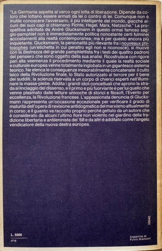 La Germania aspetta al varco ogni lotta di liberazione. Dipende da coloro che lottano essere armati da lei o contro di lei. Comunque non è inutile conoscere l'avversario, più intelligente del mondo, giacché alcuni dei suoi capi si chiamano Fichte, Hegel, Marx, Nietzsche. La prospettiva adottata da André Glucksmann in questo ormai famoso saggio-pamphlet non è immediatamente politica nonostante certi fulminei accostamenti alla realtà contemporanea; ma è per questo ancora più inquietante. Glucksmann, la personalità più rilevante fra i nouveaux philosophes (un'etichetta in cui peraltro egli non si riconosce), si muove con la destrezza del grande pamphlettista fra i testi dei quattro padroni del pensiero che sono oggetto della sua analisi. Ricostruisce con rigore pari alla veemenza il procedimento mediante il quale la realtà sociale e culturale europea venne totalmente inglobata in un gigantesco sistema teorico. Ne elenca le conseguenze inesorabilmente concatenate: il culto laico della Rivoluzione finale, lo Stato autorizzato al terrore per il bene dei sudditi, la scienza riservata a un corpo di chierici esperti nell'illuminare la massa-plebe. Addita i grandi idoli concettuali che aprono la strada al linciaggio del dissenso, e il primo e più fuorviante è per lui quello che venne plasmato dalle letture univoche di storici e filosofi, l'Evento per eccellenza, la Rivoluzione francese. L'appassionata denuncia di Glucksmann rappresenta un'occasione eccezionale per verificare il grado di maturità dell'opera di revisione antidogmatica del marxismo attualmente in corso; e il guanto va raccolto proprio perché gettato da un autore che è considerato da alcuni l'ultimo fiore non violento nel giardino della tradizione libertaria e antileninista del '68 e da altri è additato come l'angelo vendicatore della nuova destra europea.
