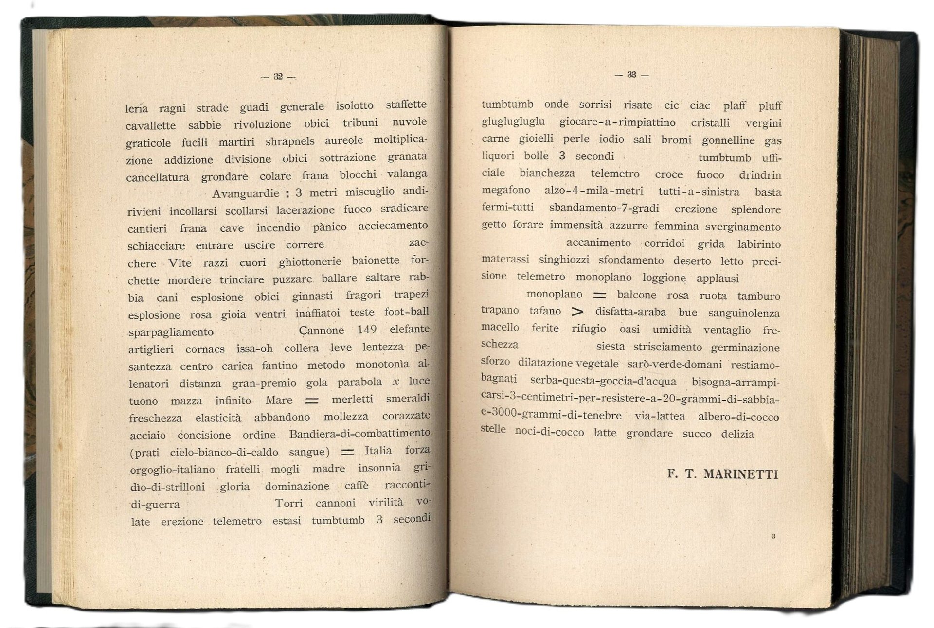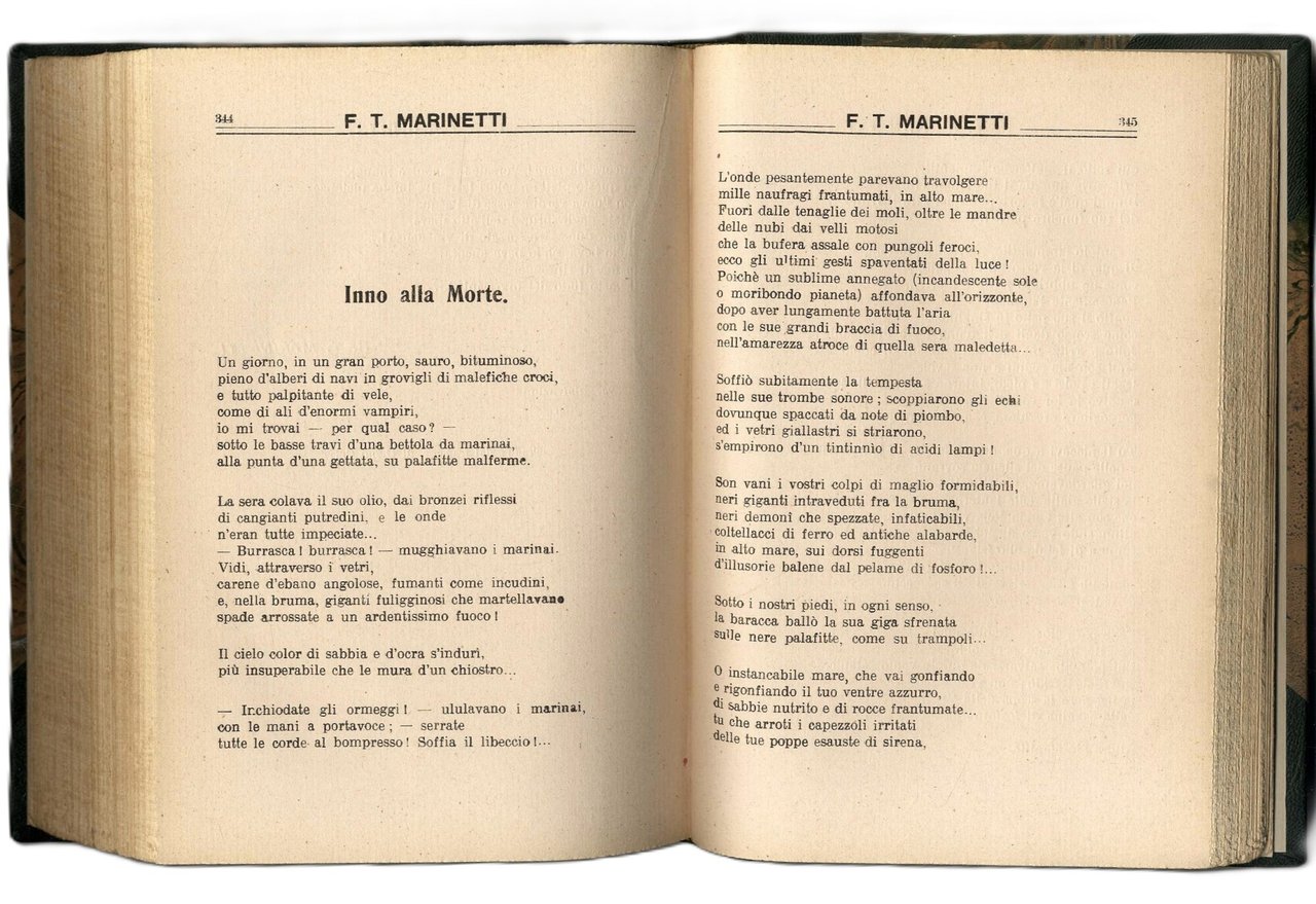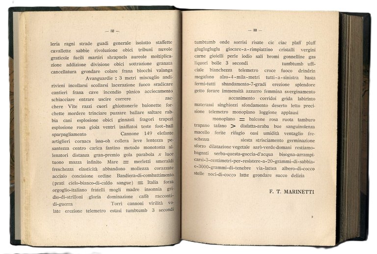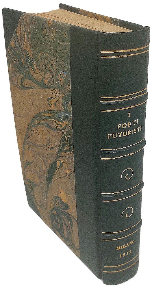 >in-8, pp. 426, (6), legatura posteriore m. pelle verde e ang., dorso a nervi con filetti e titolo oro. Presentazione di F.T. Marinetti, poesie parolibere di Libero Altomare, Mario Bètuda, Paolo Buzzi, Enrico Cavacchioli, Auro D'Alba, Luciano Folgore, Corrado Govoni, G. Manzella-Fontini, F.T Marinetti, Aldo Palazzeschi. Con un proclama di F.T. Marinetti e uno studio sul verso libero di Paolo Buzzi. Il testo marinettiano che apre l'antologia è il ''Manifesto tecnico della letteratura futurista'' dell'11 maggio 1912, seguito dalla ''Risposta alle abbiezioni'' e dal primo esempio di scittura parolalibera, Battaglia peso + odore. Edizione originale della prima raccolta antologica di poeti e poemi futuristi. Ottimo esemplare, purtroppo privo della coperta editoriale, timbro di biblioteca privata estinta all'occhietto. Spaducci p. 233. Salaris p. 74. Cammarota, Marinetti, 37 (raro).