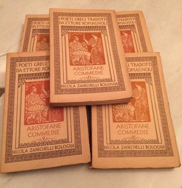 I poeti greci tradotti da E. Romagnoli. Aristofane Commedie. Cinque vol. Gli Acarnesi. I cavalieri. Le nuvole. I calabroni. La pace. Gli uccelli. Lisistrata. La festa di Demetra. Le rane. Le donne a parlamento. Pluto.