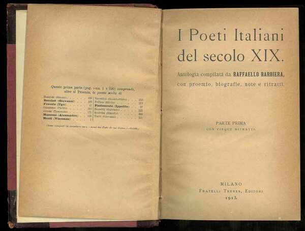 <p>19 cm, rilegatura in mezza pelle con angolari, titolo impresso in oro al dorso, p. 704. 2 volumi in 1 tomo. Antologia compilata da Raffaello Barbiera con proemio, biografie, note e 8 ritratti (5 al primo volume; 3 al secondo). Firmetta di possesso alla prima carta. Ordinarie tracce del tempo alla rilegatura, interno molto ben conservato.</p>