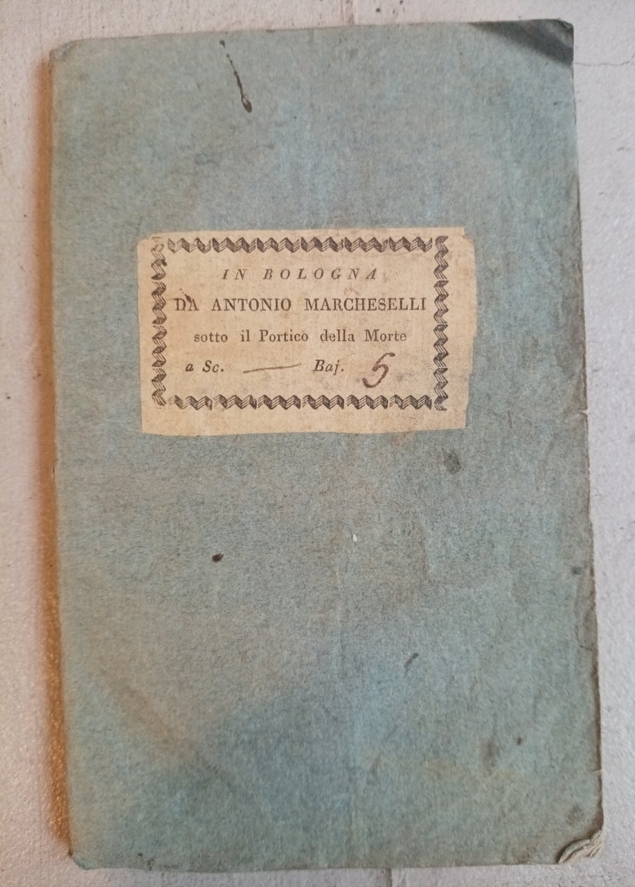 >in-8 (mm 170x109), pp. 48, brossura editoriale azzurra con tassello al piatto superiore applicato, entro cornice con indicazione che localizza un'attività commerciale in Bologna. "Edizione correttissima con l'aggiunta di alcune Note utilissime". L'autore -anonimo- redige una grammatica italiana semplice ad uso dei ragazzi, evidenziano l'inutilità dello studio del latino, lingua morta e difficile. Seguono alcune favolette morali. Incisione al frontespizio. Restauro alla pag. 40.