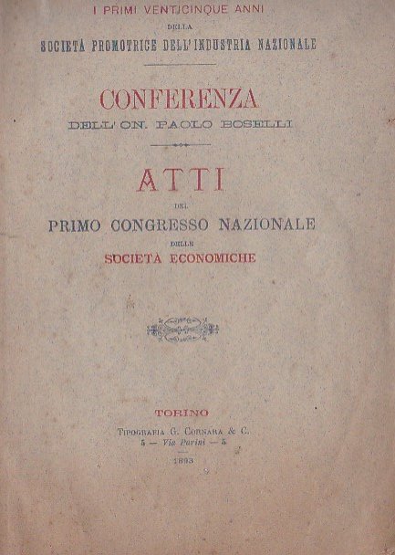 I primi venticinque anni della Società Promotrice dell'Industria Nazionale. Atti del Primo Congresso Nazionale delle Società Economiche. Conferenza tenuta nella grande Aula del Palazzo Madama in Torino il 7 maggio 1893 festeggiandosi le nozze d'argento dei sovrani e il 25° anniversario della costituzione della Società