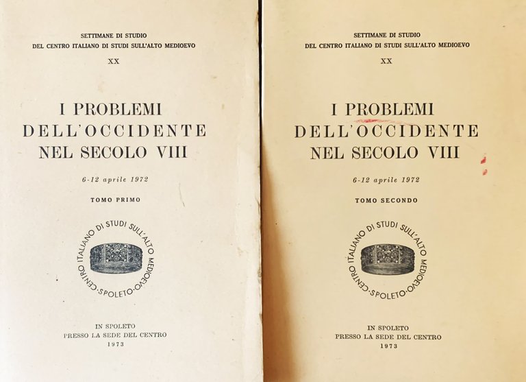 I ed.. Atti XX Settimana di studio del Centro italiano di studi sull'alto medioevo, Spoleto, Sede del Centro, 6-12 aprile 1972. Opera in due tomi in-8^ (brossure in cartoncino liscio écru con titoli in nero, 1^ tomo: pp. 1-448, 2^ tomo: (4)+449-898+(2)). Con ill. in b/n f.t.. Stato buono dell'opera nel complesso (parzialmente intonsi - il primo volume presenta una gora rossa da sfregamento al primo piatto ). Indice: Comitato direttivo del Centro italiano di studi sull'alto medioevo - Interventi - Programma della Settimana di studio - Discorso inaugurale: Girolamo Arnaldi: Bonifacio e Carlomagno - Discussione sul discorso inaugurale Arnaldi - Longobardi e Franchi (Carlichard Brühl: Zentral- und Finanzverwaltung im Franken- und im Longobardenreich - Pierre Toubert: L'Italie rurale aux VIIIe-IXe siècles. Essai de typologie domaniale - Giovanni Tabacco: la connessione fra potere e possesso nel Regno franco e nel Regno longobardo - Discussione sulla lezione Brühl - Discussione sulla lezione Toubert - Disccussione sulla lezione Tabacco) - Chiesa, Papato e potere imperiale (Ottorino Bertolini: Le origini del potere temporale e del dominio temporale dei papi - Horst Fuhrmann: Das frühmittelalterliche Papsttum und die konstantinische Schenkung. Meditationen über ein unausgeführtes Thema - Friedrich Kempf S.J.: Chiese territoriali e Chiesa romana nel secolo VIII - Discussione sulla lezione Bertolini - Discussione sulla lezione Fuhrmann - Discussione sulla lezione Kempf) - Le aree periferiche (nel Mediterraneo (André Guillou: Le ssistème de vie enseigné au VIIIe siècle dans le monmd byzantin - Gerd Tellenbach: L'Italia nell'Occidente cristiano nel fluire del secolo VIII - Francesco Gabrieli: La spinta araba nel Mediterraneo nell'VIII secollo - Discussione sulla lezione Guillou - Discussione sulla lezione Tellenbach - Discussione sulla lezione Gabrieli) - nell'Europa centrale e orientale (Frantisek Graus: Die Entwicklung Mitteleuropas im 8. Jahrhundert und die Vorbedingungen der Staatentwicklung in diesem Gebiet - Karl Ferdinand Werner: les principautés périphériques dans le monde franc du VIIIe siècle - Discussione sulla lezione Graus - Discussione sulla lezione Werner) - nelle Isole britanniche e nel nord-Europa (Herbert Jankuhn: Das Abendland und Skandinavien im 8. Jahrhundert - Donald Bullough: Alcuino e la tradizione culturale insulare)) - Cultura arte e lingua (Claudio Leonardi: Il venerabile Beda e la cultura del secolo VIII - Anker Teilgaard Laugesen: La civilisation germanique au VIIIe siècle - Cyril Mango: la culture grecque et l'occident au VIIIe siècle - Antonio Thiery: La cultura e l'arte precarolingia e protomozarabica. Comunicazione e immagine nell'VIII secolo: nuovi problemi di metodo - Hermann Fillitz: Die italienische Kunst des 8. Jahrhunderts als Voraussetzung der Kunst am Hofe Karls des Grossen - Carlo Alberto Mastrelli: Vicende linguistiche del secolo VIII - Discussione sulla lezione Leonardi - Disccussione sulla lezione Mango - Discussione sulla lezione Mastrelli) - Cinzio Violante: Epilogo.