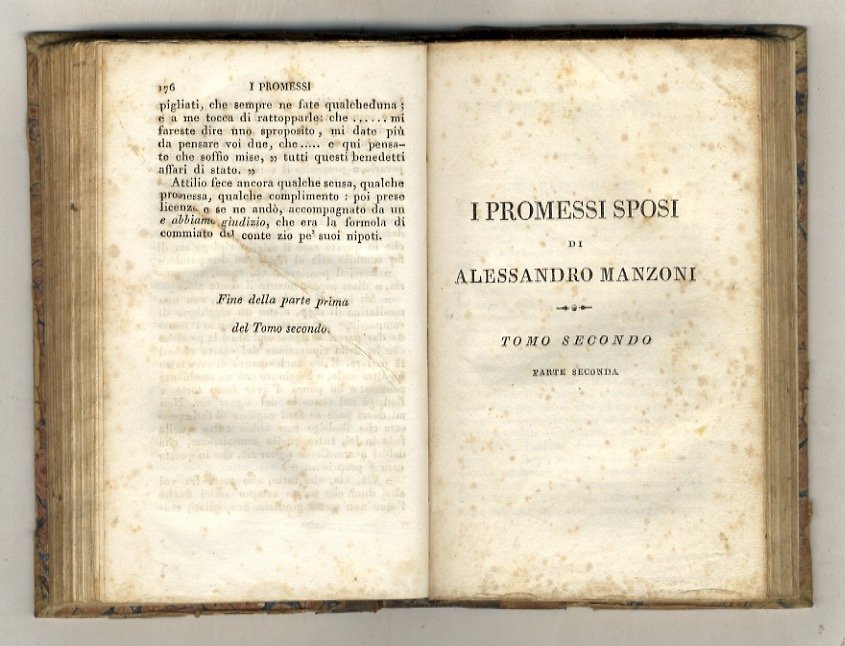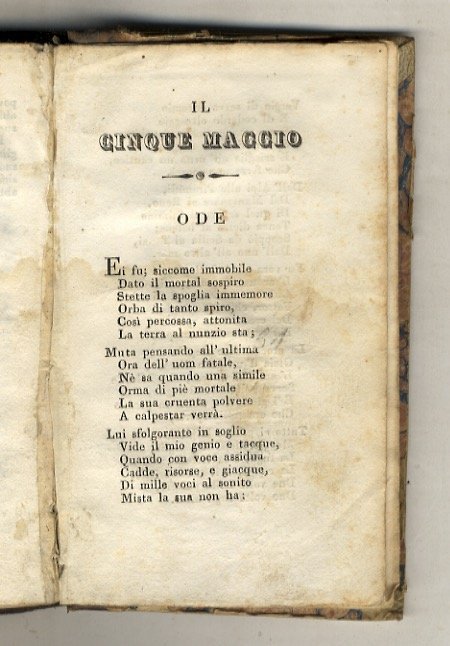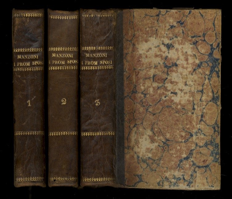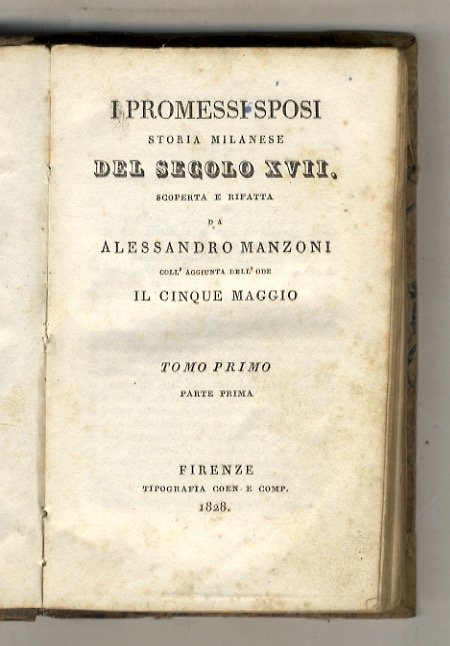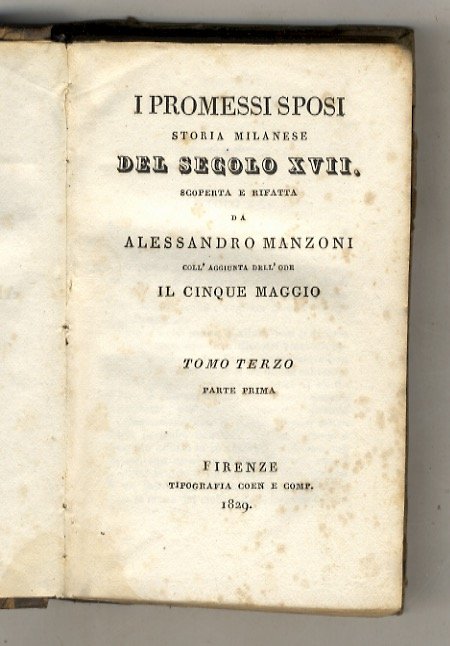 Firenze, Tipografia Coen e Comp., 1828 - 1829, volumi 3, in-16, legatura ottocentesca in mezza pelle, titolo, numero di volume e filetti in oro sui dorsi, pp. 324 - 338 - 375, [5]. Ciascun volume è diviso in due parti in paginazione continua fra di loro. ICCU segnala una antiporta, qui non presente, al primo volume, tuttavia anche l'esemplare di Casa Manzoni ne è sprovvisto, come il nostro. I Promessi sposi e l'ode Il Cinque Maggio sono completi, i tre volumi facevano però parte di una edizione delle opere del Manzoni stampata in sei volumi. Edizione dei Promessi sposi di un anno successiva alla prima, edita nel 1827 (pur portando la data 1825-1827). Occhietti conservati. Mancanza all'angolo inferiore esterno (margine bianco) di una carta del primo volume (6*) e al margine bianco inferiore di una carta del terzo: buon esemplare.