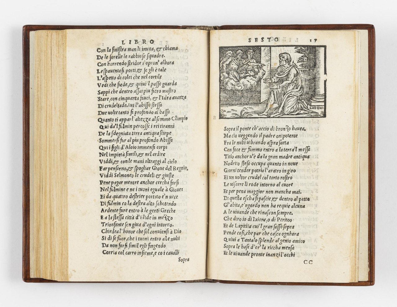 Sei parti in un volume in 8vo (mm. 152x92). Cc. 24; 23, [1]; 20; 19, [1]; 27, [1]; 25, [7]. Segnatura: A-C8; 2A-2C8; Aa-Bb8 Cc4; 3A-3B8 3C4; Aaa-Ccc8 Ddd4; AA-DD8. Sono bianche le carte 2C8, 3C4, Ddd4 e DD8. Colophon alla c. DD7v. Ogni libro, eccetto il primo, inizia con proprio frontespizio. Primo frontespizio generale dell'opera stampato entro elaborata cornice figurata, ritratto di Virgilio (tratto dall'edizione del 1528) sui frontespizi dei libri 2-6. Con 22 vignette in legno nel testo (alcune ripetute); di queste 10 vengono dall'edizione del '28, mentre le restanti furono incise appositamente per questa edizione. Legatura moderna in piena pelle con fregi a secco ed in oro in stile rinascimentale. Antiche firme di appartenenza, in parte cassate, sul primo frontespizio. Fioriture e tracce d'uso, qualche alone sparso, ma nel complesso copia più che buona.