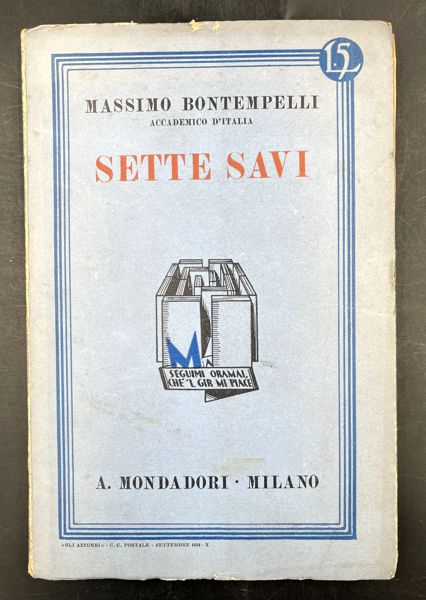 In-8° (cm. 19,3x12,8), pp. 151, (4). Cartoncino leggero editoriasle a risvolti. Collana "I libri azzurri". Contiene: 1, Dialogo metafiscìico e prelimnare tra il numero 56 e il rosso. 2. Il giusto mezzo. 3. La paura di morire. 4. La regole. 5. L'iniquità. 6. La giustizia e la vendetta. 7. Il ribelle in riga. 8. L'ombra e il sole. "Alcuni racconti del Socrate moderno e dei Sette savi, pur non presentando nessuna aperta velleità innovativa, esprimono già abbastanza chiaramente certe linee di tendenza nella costruzione delle situazioni e delle psicologie, che lasciano indovinare gli sviluppi successivi. Il timbro stilistico dominante è quello di un intimismo macerato d'ironia malinconica, che ha richiamato a taluni critici (con qualche forzatura) i nomi dei contemporanei Pirandello e Palazzeschi, e ad altri (forse con maggiore attendibilità storica) quello di A. Albertazzi. casi bizzarri di originalità psicologica confinanti col patologico (Il giusto mezzo) o, più semplicemente, umoristiche divagazioni sulla stranezza del carattere umano (La paura di morire).i" (Treccani). Meritò una riedizione nel 1991. Non comune,