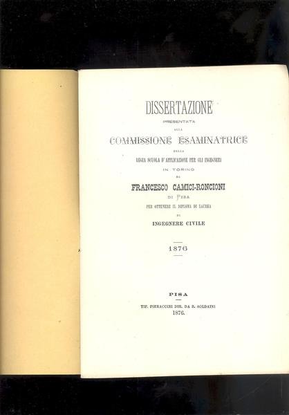 IN 8°, pp. 25, COPERTINA EDITORIALE CON TITOLO.<BR>DISSERTAZIONE PRESENTATA ALLA COMMISSIONE ESAMINATRICE DELLA REGIA SCUOLA D'APPLICAZIONE PER GLI INGEGNERI IN TORINO DA FRANCESCO CAMICI-RONCIONI DI PISA PER OTTENERE IL DIPLOMA DI LAUREA DI INGEGNERE CIVILE.<BR>OTTIMA CONSERVAZIONE.ID 1779