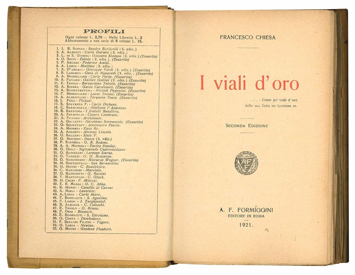 In 16mo (mm 167x103); pp. [4], 174, [2]. Frontespizio stampato in rosso e in nero. Carta uniformemente brunita. Similpergamena editoriale illustrata. Fa parte della collana "Poeti Italiani del XX secolo". Seconda edizione nella quale l'A. soppresse l'intero componimento "Tarpea" ed operò numerose modifiche. Ottimo esemplare ancora a fogli chiusi.