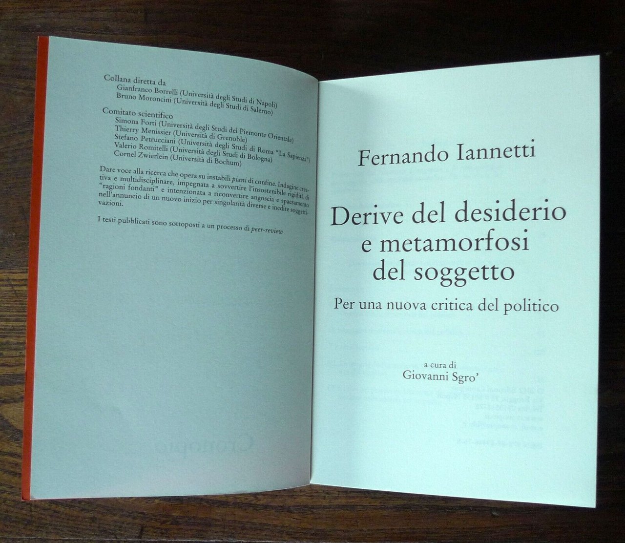 Fernando Iannetti,DERIVE DEL DESIDERIO EMETAMORFOSI DEL SOGGETTO.Per una nuova critica del politico.A cura di Giovanni Sgro'.Edizioni Cronopio, Napoli 2012,brossura, 21x15 cm., pp.207,PIANIcollana diretta da Gianfranco Borrelli e Bruno Moroncini,ISBN: 978-88-89446-76-8,peso: g.350