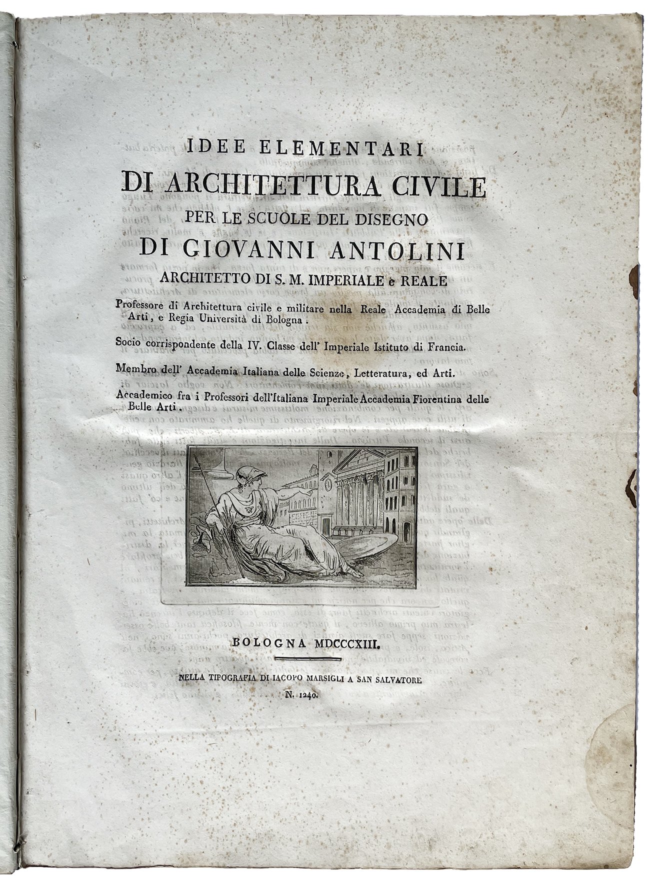 First edition published in conjuction with the brothers Masi, whose name appears in certain copies instead of that of Marsigli. A second, enlarged edition was issued soon after in the same year at the author's expenses. A third edition was printed in Milan in 1829. It is a manual of civil architetcture conceived as a teaching tool for the students of architectural drawing.