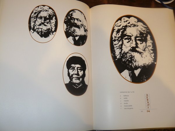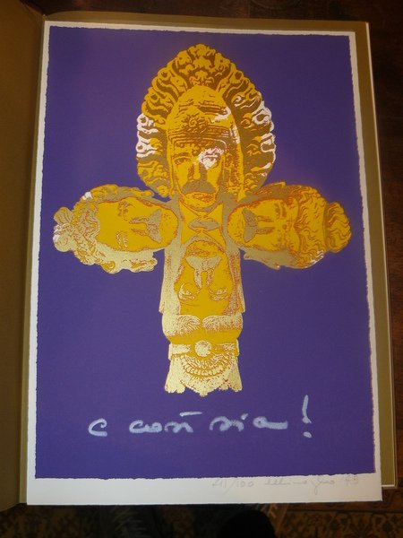 In-folio, pp. 94, molte illustrazioni nel testo, una serigrafia numerata e firmata dell'autore inserita in cartella slegata dal volume, legatura in mezza pelle con titolo al dorso. Questo volume è stato realizzato dallo stabilimento tipografico Ferrero in Romano Canavese, su carta nivis matt delle cartiere C.I.R. e legato a mano da Pier Giovanni Baldissone. Ogni volume contiene una serigrafia originale dell'autore, stampata su carta a mano della cartiera magnani di Pescia con numerazione corrispondente al volume. Tiratura di cento esemplari numerati e firmati a mano dall'artista, il nostro è il n. 41. Prendendo a prestito la tecnica dell'identikit, Miroglio ricerca il vero volto di Dio, provando a ricostruire la sua immagine. L'artista mette insieme trenta immagini di dei adorati nel corso dei secoli in diverse culture e di personaggi storici, partendo dal Giove di Otricoli, utilizzando fra gli altri i volti del Redentore in S.Apollinare Nuovo, quello di Karl Marx e di Mao Tse Tung, e inserendo nella lista anche il suo. Procedendo nella ricerca il volto del Signore pare essere molto simile a quello dell'artista, che rifiuta il ruolo e si cancella. Da tale operazione nasce il libro Identigod (Ed. Priuli&Verlucca)
