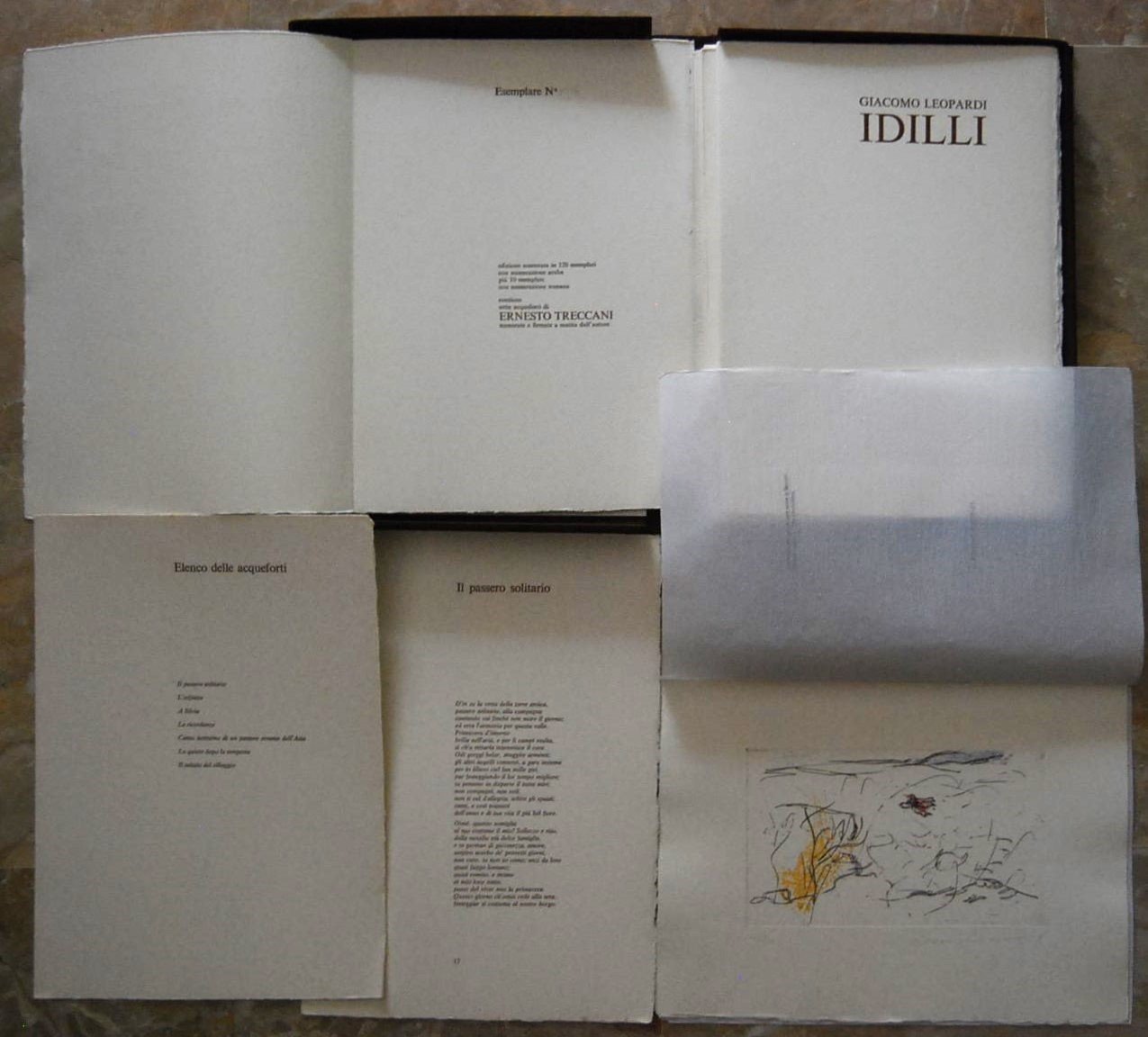 Edizioni Cantini, 1960. Cartella editoria in tela, contenente la presentazione di Solmi e le poesie di Leopardi su doppi fogli sciolti e le sette acqueforti a colori, numerate e firmate, di Ernesto Treccani. Edizione di 120 copie numerate. Tracce d'uso alla cartella, fogli interni in ottimo stato.