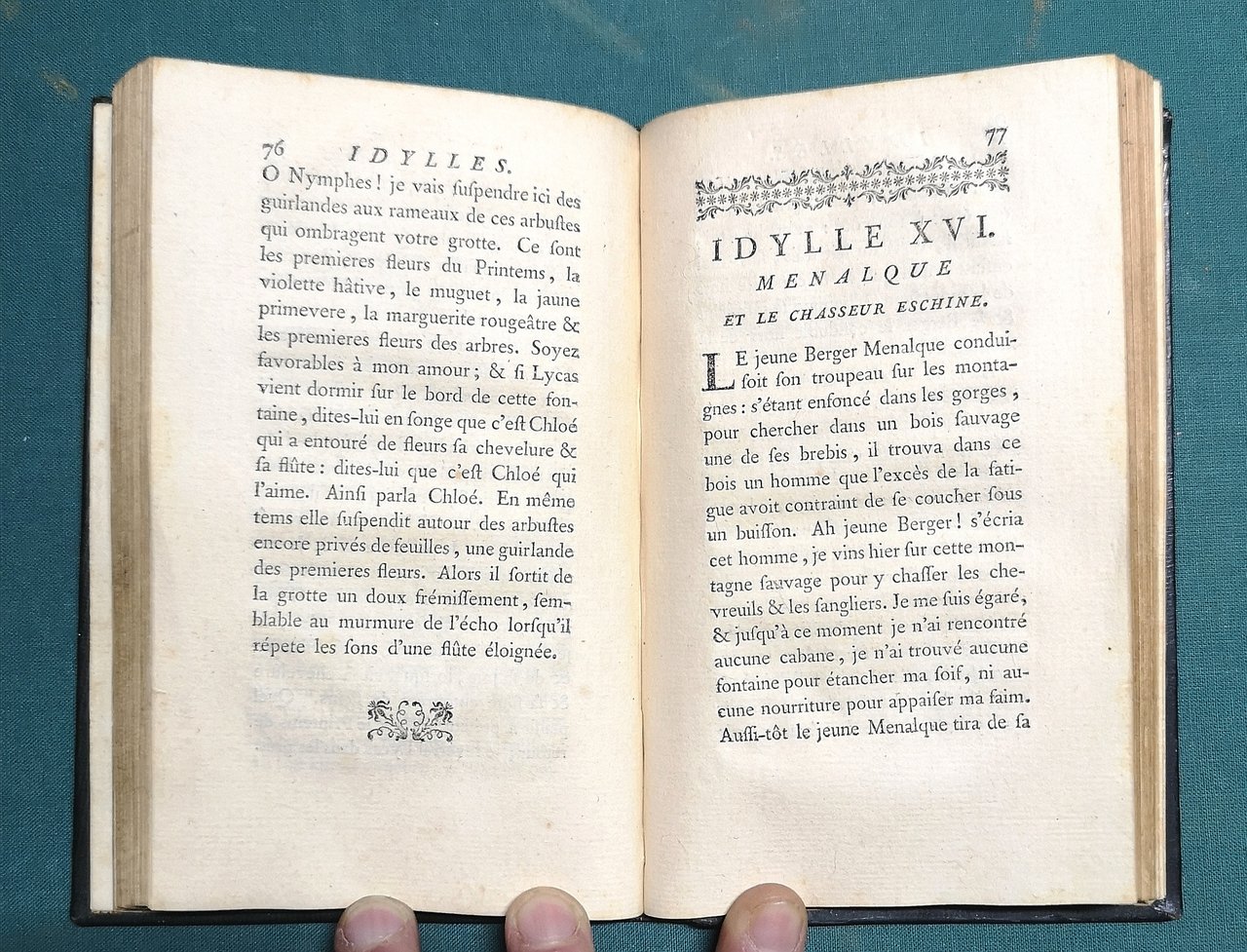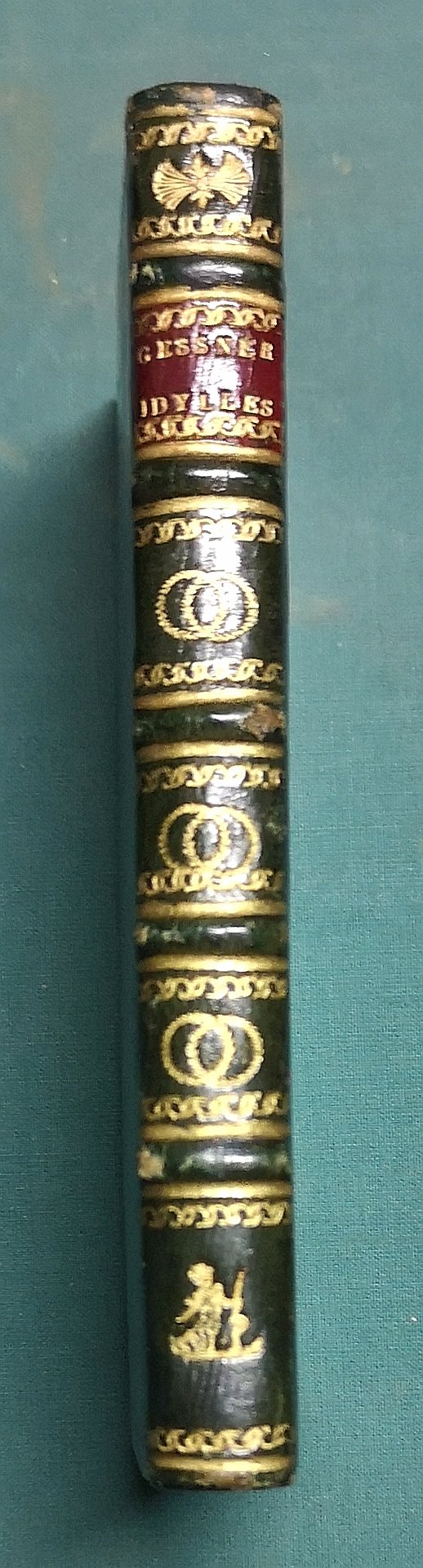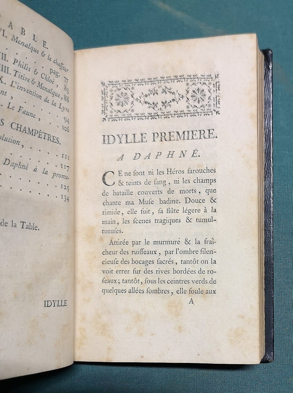 >in-16, pp. pp. XLVI, (2) di indici, 154, (4) di approvazione e privilegio, 11 testatine e culs de lampe di Lavallée e Poussin incisi da Watelet e Marguerite Lecomte. Magnifica legatura coeva in p. pelle verde, doppia cornice in oro ai piatti, titolo in oro su tassello e ricchi fregi in oro su dorso a nervi, tagli dorati. Edizione originale della traduzione francese di questi idilli pastorali. Ottimo esemplare, in bella legatura, purtroppo mancante l'antiporta incisa. Cohen-Ricci, 431.