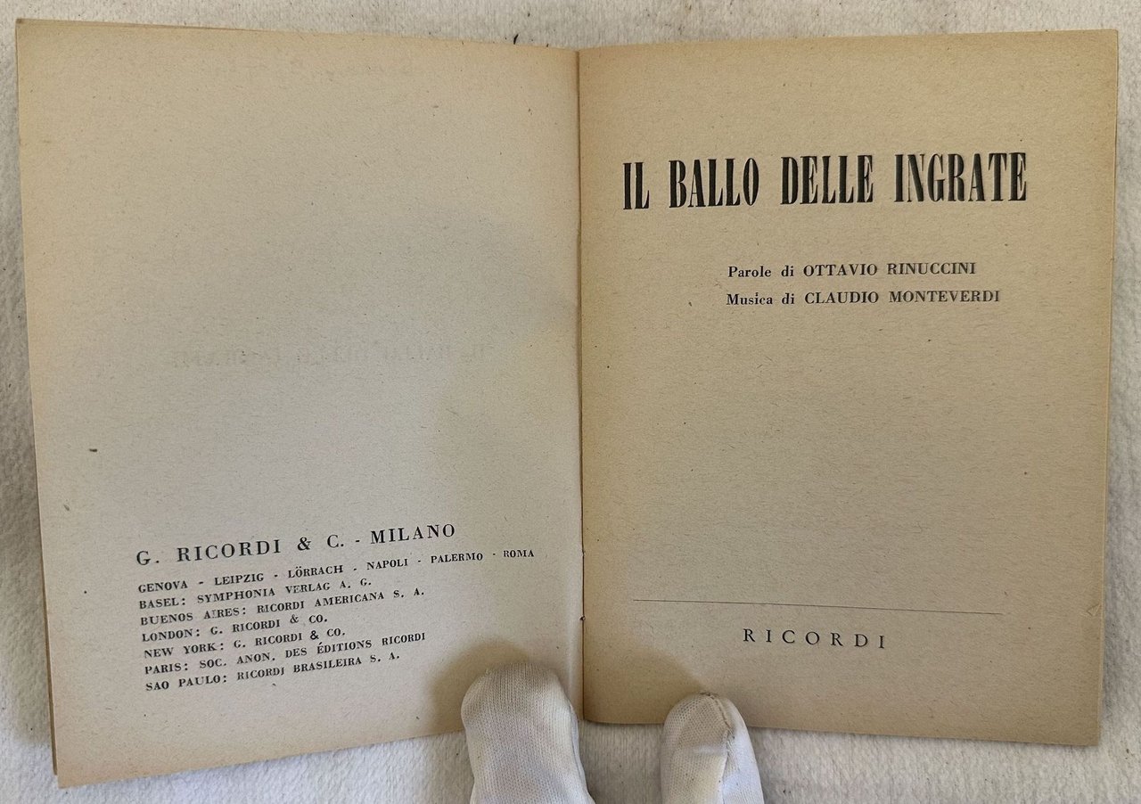 Bel libretto d'opera del 1954 dell'opera "Il ballo delle ingrate" di Claudio Monteverdi. Testo di Ottavio Rinuccini. Nota manoscritta al frontespizio "Scala 9/6/54 Giulini". In ottime condizioni. Copertina editoriale in ottime condizioni generali con lievi usure ai margini e dorso. Legatura in buone condizioni. All'interno le pagine si presentano in buone condizioni con rare fioriture. In 16. Dim. 13,5x10 cm. Pp. 20.