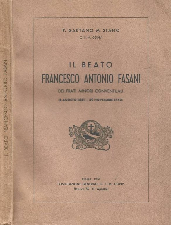 Biografia del beato Francesco Antonio Fasani, ritratto all'antiporta; brossura datata con pagine brunite rilegate filo refe, esiguo il corredo illustrativo nel testo, fioritura agli ampi margini, tagli irregolari. Copertina morbida di carta con alette scurita da polvere, piccole lacerazioni ai bordi di piede. Cerniera stretta. N. pag. 138.