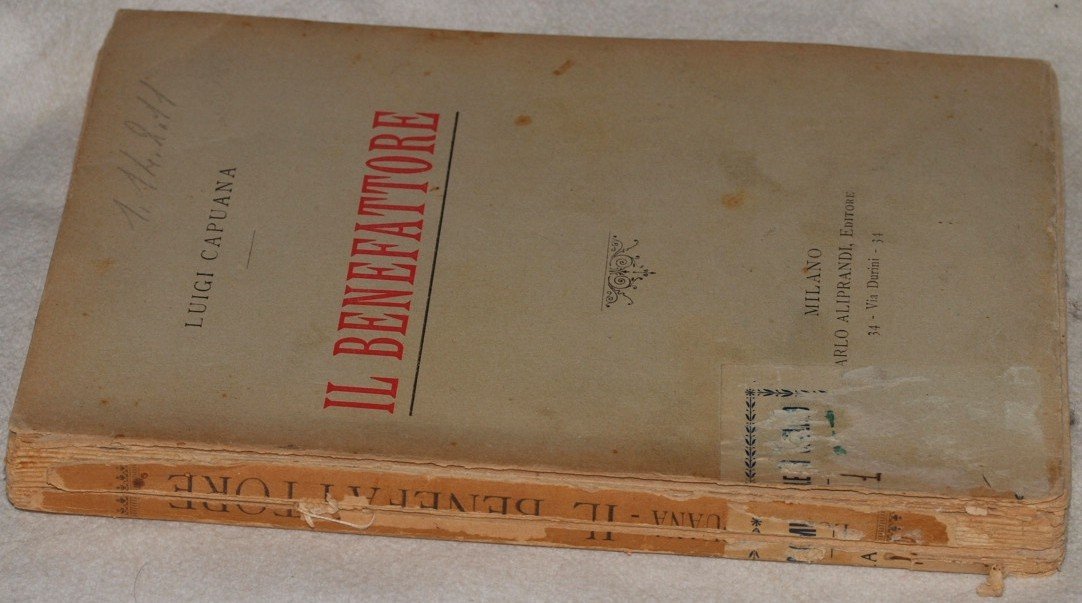 In 8. Dim. 19,5x13 cm. Pp. 233+(3). Edizione senza data ma dei primi del '900 di questa raccolta di racconti dello scrittore siciliano Luigi Capuana (1839-1915). La prima edizione venne pubblicata dallo stesso editore nel 1901. Frontespizio mancante, rileviamo i dati editoriali dalla brossura. All'interno sono presenti i seguenti racconti: Il benefattore; Per un sogno; Raccontava il dottor Maggioli; Care parentesi; Enimma. Brossura editoriale originale. Molto rara, alto valore. Brossura editoriale in mediocri condizioni generali con usure e parti mancanti ai margini e dorso; piatto anteriore staccato e rotture al dorso; etichetta. Legatura in mediocri condizioni con rotture. All'interno le pagine si presentano in ottime condizioni con rare fioriture. Not dated edition but of the first years of 1900 of this collection of tales by the writer from Sicily Luigi Capuana (1839-1915). The first edition was published by the same editor in 1901. Titlepage is missing, we understand the editorial data from the title page. Inside the following tales: Il benefattore; Per un sogno; Raccontava il dottor Maggioli; Care parentesi; Enimma. Editorial original cover. Very scarce copy, high value. Editorial cover in poor general conditions with wearings and missing parts in the edges and spine; front plate detached and cracks in the spine; label. Binding in poor conditions with cracks. Inside pages are in very good conditions with occasional foxings.
